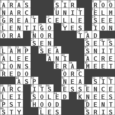 ACROSS 1. Ancient river in northeast Turkey 5. Title for a knight 8. Friend of Pooh 11. Drug cop 12. A single undivided whole 14. Shade tree 15. Relatively large 17. Cell (Danish) 18. Observe 19. Small, flat, pigmented spot on the skin 21. Affirmative reply 22. Electrically charged atom 23. Mouth or opening 24. Or not 25. Small boy 27. Elected rep. 28. Arranges properly for use 31. Desk light 35. Ocean 37. In a ____ (agitated or irritated) 38. Toward shelter 39. Black tropical American cuckoo 41. Measure of real estate 42. Charged atoms 43. Period 45. Rendezvous 46. Make new 47. The grampus (Milton) 49. Cleo's killer 51. Teachers' org. 52. Be seated 55. Curve 57. It is 60. Core 62. Flowery wreath 63. Having a sole or soles 65. Leg joints 66. Pacific Standard Time (abbr.) 67. Parka part 68. Scratch 69. Filthy place 70. French article 71. Indian titles of respect DOWN 1. White American of non-Hispanic descent 2. Less widely known 3. Sports stadium 4. Scram, to a cat 5. Institute legal proceedings 6. Inwardly 7. Cause heat under the collar 8. Dwelling 9. Margarine 10. Sign of something about to happen 13. Trial 16. Canisters 17. Pupil covering 20. Moves 26. Indian state 29. Hoop that covers a wheel 30. Proofreading order 31. Den 32. Medicinal plant 33. Ananias' fault 34. Mexican monetary units 36. A saturated hydrocarbon 40. Pressed 44. Ancient Greek god of war 48. Keg 50. Expression of disdain 52. Scornful expression 53. Ancient Celtic tribe of eastern Britain 54. Trials 55. High mountains 56. State of inaction 58. Utensil 59. _ gin 61. Extremities 64. Begley and Asner