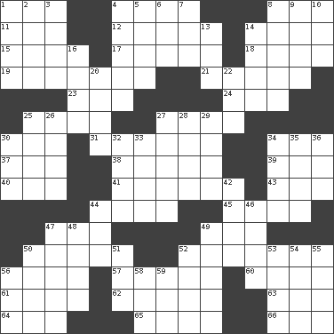 ACROSS 1. Shoshoni 4. Corncob 8. Fish or hair follower 11. Car or cant ending 12. Lacking in sense or substance 14. Farming town in central California 15. Straggles 17. A person who is older than you are 18. So be it 19. The state or an instance of erring 21. Believer in; advocate of (suffix) 23. Standoff 24. Conclusion 25. Sever or remove by pinching or nipping 27. Old wives' tales, e.g. 30. Santa ___, CA 31. Fodder prepared in a silo 34. Indian title of respect (Mr.) 37. Hit sharply and swiftly 38. Cowboy competition 39. Krazy ___ of comics 40. Accounting whiz (abbr.) 41. Most capable 43. Help 44. Leg joint 45. Signal 47. Compete 49. Large container 50. Scorch 52. Chrissie's court nemesis 56. Eighteen holes 57. Gurus 60. Mouths or openings 61. Grain storage tower 62. Sadhe (variant) 63. Compass dir. 64. According to 65. Ancient Greek god of war 66. R.R. building DOWN 1. Ubangi River tributary 2. Lacerate 3. Engineer (abbr.) 4. Part 5. In an inward manner 6. Writing tablet 7. Compass dir. 8. Roamer 9. Locale of original sin 10. Shallow baking pan 13. Period 14. (Had) reclined 16. Suttee (variant) 20. Pinches, bites 22. To riddle 25. Fastener 26. California wine valley 27. Dipping utensil 28. Double curve, resembling the letter S 29. Vintage cars 30. Curve 32. SW Asia republic 33. Ear part 34. Heroin 35. Precipitation 36. It would 42. Russian ruler of old 44. Barrel 46. "Tell ____ the Marines!" 47. Country residence 48. Information 49. Flower holders 50. Land 51. Eastern Standard Time (abbr.) 52. Ancient Persian 53. Angers 54. Political cartoonist Thomas 55. At sea 56. Girls' org. (abbr.) 58. White ___ sheet 59. Slender fish