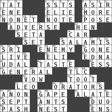 ACROSS 1. Make lace 4. Fast planes 8. SW Saudi Arabia district 12. Compass dir. 13. Writer Wiesel 14. Greater amount 15. Music written for nine 18. Brief written record 19. Airs 20. Contrary to your interests or welfare 22. Layer 23. Bristle 24. Auto 25. Arrange properly for use 26. Deli grouping 30. Indian title of respect (Mr.) 33. Foe 36. Went 37. Moving, as bait 39. Biblical high priest 40. Pulitzer Prize-winning author Ferber 41. Hereditary estate 42. Clothes sense 44. Double-curved letter 45. Commissioned military rank 47. Affectionate concern, for short 50. Solemn pledge 51. A blast of a horn 53. Lion 54. Speakers 57. Soon (poet.) 59. Stare wonderingly 61. Having winglike extensions 63. Back-to-school mo. 64. Pismires 65. Superhero pair 66. Romantic infatuation 67. Egg locale 68. Followers of ems DOWN 1. Nine, plus one 2. Small Philippine buffalo 3. Watches over 4. Elected reps. 5. A type of plum 6. Teat (slang) 7. Perceive with the eye 8. Electrical Measurement 9. Within a short period 10. Big collection agency 11. Portuguese money of account (variant) 16. Nights before holidays 17. False hair 21. Assign a rank or rating to 22. Actor Linden 24. Island 26. Stricken, poetically 27. Method 28. Lodging establishments 29. Oceans 30. Snaillike creature with no shell 31. Travel on an animal 32. "Terrible" tsar 34. Anneal 35. Raised railways 38. Veterans Day date 42. The 23rd letter of the Hebrew alphabet 43. Singer James 46. Friend of Pooh 48. Globular water bottle used in Asia 49. Calm and collected 52. Barter 53. Chops off 54. Elects 55. Repose 56. Astound 57. Viper 58. Teachers' org. 59. Separate the seeds from cotton 60. One (Scot) 62. Greek goddess of the dawn