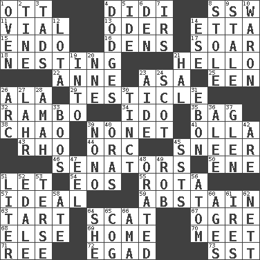 ACROSS 1. Baseball player Mel 4. "You Light Up My Life" star Conn 8. Compass dir. 11. Small bottle 13. Baltic tributary 14. Singer James 15. Inside; within (prefix) 16. Lairs 17. Fly high 18. Snuggling 21. Phone greeting 22. Singer Murray 23. White ___ sheet 25. Car or cant ending 26. In the manner of 29. A testis 32. Role for Stallone 34. Wedding promise 35. Container for groceries 38. US Secretary of Labor Elaine L. _ 39. Music written for nine 41. Spanish pot 43. 17th letter of the Greek alphabet 44. The grampus (Milton) 45. Contemptuous expression 46. Elected representatives 50. Compass dir. 51. Allow 54. Greek goddess of the dawn 55. Round or rotation of duties 57. Standard of perfection 59. Refrain by choice 63. Small pie 64. Scram! 67. Legendary monster 68. Otherwise 69. Dwelling 70. Rendezvous 71. To riddle 72. Mild oath 73. Fast jet (abbr.) DOWN 1. Baking chamber 2. Prong on a fork 3. Bits 4. Evades 5. Binary compound 6. Lair 7. Big collection agency 8. Took without asking 9. Having lost freshness 10. Make _____ (do battle with) 12. Globular water bottle used in Asia 14. Compass dir. 19. To the inside or interior of 20. Compass dir. 21. Actor Linden 23. Assistant 24. Native of Scotland 26. Curve 27. Cowardly lion portrayer 28. Housemaid 30. A color or tint 31. Inky black, to poets 33. Scornful sounds 36. Toward shelter 37. Small, secluded valley 39. Words to Nanette 40. Mouths or openings 42. "We ___ not amused" (Victoria) 45. Fast planes 47. Snakelike fish 48. Spoke pompously 49. Director Reiner 51. 61 cubic inches 52. Peak District village in England 53. Laconic 56. Tiny particle 58. Had dinner 60. Eons 61. Angers 62. Remaining after all deductions 64. A female animal or person 65. Gear tooth 66. Nanny (var.)