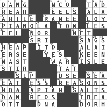 ACROSS 1. Mild oath, euphamism for damn 5. Non-commissioned officer (abbr.) 8. Small amount or degree 11. Posterior 12. Snakelike fish 14. In the manner of 15. Nick name for Arthur 17. The wife of a rajah (variant) 18. Myrna of the movies 19. Player piano 21. Pull behind 22. French article 23. Snakelike fish 24. Not either 25. Fish or hair follower 27. Indian title of respect (Mr.) 28. Droops 31. Pile 35. It would 37. Mountain range southwest of Kyrgyzstan 38. Celtic language 39. Consenting reply 41. Peachy ____! 42. Political cartoonist Thomas 43. Armed conflict 45. Capri or Wright 46. Tumult 47. Make lace 49. Small drink 51. Purpose 52. Ocean 55. Ingest 57. Double-curved letter 60. Thinks logically 62. Basketball assoc. 63. Bee-related 65. Table seasonings 66. One of the 12 tribes of Israel 67. Vintage cars 68. The content of cognition 69. Baseball player Mel 70. Heredity factor (abbr.) 71. Dormintory (informal) DOWN 1. Window treatment 2. Nest on high 3. Brizilian seaport 4. Broad smile 5. Teachers' org. 6. Penny 7. Margarine 8. Baron Munchausen's specialties 9. Medicinal plant 10. 24-hour periods 13. Stitched 16. Immeasurably long periods of time 17. Noteworthy scarcity 20. Australian parrot (variant) 26. 1973 Nobel Price Winner (Physics) Leo 29. Highlander 30. Trig term 31. Coop moms 32. Part of Q.E.F. 33. Aide 34. _ dish (used to culture cells) 36. Morning condensation 40. Titan orbits this 44. Raze (variant) 48. Beverages made from leaves 50. Lightbulb-shaped fruit 52. Twentieth part of a lira 53. Keyboard key 54. Indian state 55. Inside; within (prefix) 56. Blind as ____ 58. Moved rapidly 59. The Jewish people; Israel 61. Stated 64. White ___ sheet
