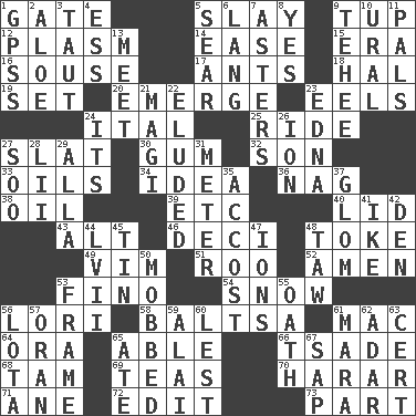 ACROSS 1. Yard entry 5. Kill 9. Uncastrated adult male sheep 12. Suffix with ecto or cyto 14. Comfort 15. Period 16. Lush 17. Pismires 18. Actor Linden 19. Put into a specified state 20. Develop 23. Snakelike fish 24. Slanted text style (abbr.) 25. Travel on an animal 27. Narrow board 30. Chewing product 32. Boy, to dad 33. Lubricates 34. The content of cognition 36. Tired old horse 38. Petroleum 39. And so on (abbr.) 40. Flaplike covering 43. The first octave above the treble staff 46. Tenth: prefix 48. Casino tip 49. Zeal 51. Friend of Pooh 52. So be it 53. A pale, very dry sherry 54. Frozen precipitation 56. Australian parrot (variant) 58. Greek mezzo-soprano Agnes 61. Apple computer (short form) 64. Mouth or opening 65. Competent 66. Sadhe (variant) 68. Scottish cap 69. Afternoon social gatherings 70. Ethiopian city, capital of Harari 71. One (Scot) 72. Prepare for publication 73. Role in a play DOWN 1. Global Positioning Systems (abbr.) 2. Medicinal plant 3. Pulled tight 4. Double-curved letter 5. Scorch 6. Long (Scottish) 7. Michaelmas daisies 8. Affirmative reply 9. Giggle 10. Mountain range 11. Friends 13. Confront 21. Wise men 22. Evaded 23. Pulitzer Prize-winning author Ferber 24. ___ a Wonderful Life 26. Electrically charged atom 27. "Barney Miller" actor Jack 28. Cards in a Roman deck? 29. Silent film actress Nazimova 31. Distance measurement 35. Buttonhole 37. Seize upon or latch onto something 41. Mamie's mate 42. Lair 44. 57 in ancient Rome 45. Metal container 47. Charged particles 48. The 23rd letter of the Hebrew alphabet 50. Crowded into 53. Movie unit 55. Pledge 56. Globular water bottle used in Asia 57. Northwest Algerian city 59. Mountain range southwest of Kyrgyzstan 60. For fear that 61. Hindu Mythology: god of death 62. The sixth month of the Jewish calendar 63. Foregone conclusion 65. Had dinner 67. Plant excrement