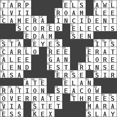 ACROSS 1. Canvas cover 5. Raised railways 8. Leather borer 11. 57 in ancient Rome 12. Wander 13. Area sheltered from the wind 14. Device for capturing images 17. Event 19. Tallied 21. Opts 22. Dutch treat 23. Elected rep. 24. R.R. building 27. Snake ____ (dice throw) 29. It is 32. Monte _, Las Vegas Hotel/Casino 34. To sift 36. Part of Q.E.F. 37. Toward shelter 38. Separate the seeds from cotton 39. Old wives' tales, e.g. 40. Grant temporary use of 41. Eastern Standard Time (abbr.) 42. Remove soap 43. White ___ sheet 44. Celtic language 46. Title for a knight 47. Had dinner 50. Style 52. Food allowance for one day 55. Manatee 57. Make much ado about nothing 59. Triads 62. By way of 63. Proofreading order 64. Hindu Mythology: god of death 65. Double-curved letter 66. Dry husk or covering 67. Kill DOWN 1. Affectionate concern, for short 2. Actress Gardner 3. Basketball hoops 4. Part 5. Period of immesurable duration 6. Shoestrings 7. Grin 8. Actor Baldwin 9. Left 10. Allows 12. To free from 15. Cowboy competition 16. Like ___ of sunshine 18. Lair 20. Develop 24. Any of the three canals of the cochlea 25. Lies 26. Sports stadium 28. Gospel singer Marvin 29. Removes the wrinkles 30. Tarsus (plural) 31. Navigate 33. Directed 35. Main course 36. Biblical high priest 42. Arrive at 45. Narrow board 47. Atmosphere 48. Cod relative 49. Maternal 51. Typical models 52. Be footloose 53. Opinion 54. Afternoon social gatherings 55. Put into a specified state 56. Welt 58. John Ritter's dad 60. Period 61. Declare