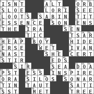 ACROSS 1. Is not 5. Keyboard modifier key 8. Globe 11. A type of plum 12. Australian parrot (variant) 14. Perceive with the eye 15. Plunders 17. Unit of acoustic absorption 18. Teat (slang) 19. Core 21. Male offspring 22. Followers of ems 23. Definite Article 24. Lyricist Gershwin 25. Elected rep. 27. Nervous spasm 28. Russian ruler of old 31. Pile 35. Male child 37. Flintstone garb 38. Celtic language 39. Soggy 41. _ the terrible 42. Political cartoonist Thomas 43. A female animal or person 45. Sure thing 46. Disorderly outburst 47. Begley and Asner 49. Title for a knight 51. Ocean 52. ___ good deed 55. Pacific Standard Time (abbr.) 57. Curvy letter 60. Heighten or intensify 62. Mouth or opening 63. Grain storage towers 65. Underwater navigation system 66. Shallow baking pan 67. Tense 68. Suttee (variant) 69. Fast jet (abbr.) 70. Was introduced to 71. Woody plant DOWN 1. Small island 2. Make a splashing sound 3. Trap for birds or small mammals 4. False hair 5. Wing 6. Tennis shots 7. Musical group of three 8. Clearly or manifestly demonstrative 9. It's straight from the horse's mouth 10. Wagers 13. Lodging establishments 16. In a ____ (agitated or irritated) 17. Manatee 20. Baby bed with high sides 26. Principle of right and wrong 29. The sixth month of the Jewish calendar 30. Monthly bill 31. Coop moms 32. Part of Q.E.F. 33. Aide 34. _ dish (used to culture cells) 36. It is so 40. College paper 44. Genesis locale 48. Backtalk 50. Relief 52. Middle Eastern gold or silver currency 53. Speak pompously 54. Nest on high 55. Cooking vessels 56. Indian titles of respect 58. Thailand, formerly 59. Turn sharply 61. Mail 64. Baseball player Mel