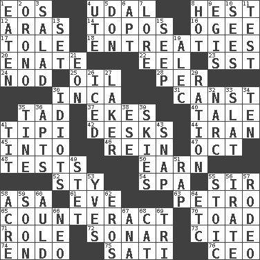 ACROSS 1. Greek goddess of the dawn 4. Hereditary estate 8. Command 12. Ancient river in northeast Turkey 14. Literary convention 16. Double curve, resembling the letter S 17. Lacquered or enameled metalware 18. Pleas 20. Maternal 22. Snakelike fish 23. Fast jet (abbr.) 24. Lower and raise head in agreement 25. Lubricate 28. For each 30. South American Indian 31. 2nd pers. sing. pres. of can (arch.) 35. Bit 37. Makes supply last 40. Lie 41. Native american tent (variation) 42. Writing tables 44. SW Asia republic 45. To the inside or interior of 46. It's straight from the horse's mouth 47. Sep. follower 48. Trials 50. Merit 52. Filthy place 54. Health resort 55. Title for a knight 58. White ___ sheet 61. First lady 63. Stone: prefix 65. Frustrate 70. Frog relative 71. Hero or heavy, e.g. 72. Underwater navigation system 73. Quote 74. Inside; within (prefix) 75. Suttee (variant) 76. Corporate head (abbr.) DOWN 1. Eroded 2. U. of Maine site 3. First course 4. Shoshoni 5. Spanish title 6. Fitting 7. Old wives' tales, e.g. 8. Being at a high temperature 9. The front part of a cuirass 10. Observes 11. Trial 13. Arrange properly for use 15. Ooze 19. Actor Baldwin 21. A really long time 26. On the rocks 27. Member of a famous L.A. basketball team 29. Food allowance for one day 30. Foolish or stupid persons 32. Drug cop 33. Narrow board 34. Nine, plus one 35. Prong on a fork 36. Tenement units (abbr.) 38. Compass dir. 39. Atmospheres 41. Teat (slang) 43. Fastener 49. Proofreading order 51. Reproach for some lapse or misdeed 53. Jacques Cousteau's middle name 55. Unemotional 56. Feeling or showing extreme anger 57. Cowboy competition 58. 43,560 square feet 59. Within a short period 60. Old (Scot.) 62. Greek god of love 64. And so on (abbr.) 66. Modern: prefix 67. Santa ___, CA 68. Feline 69. Three (prefix)
