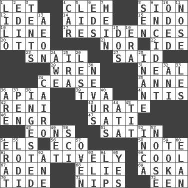 ACROSS 1. Allow 4. Clement's nick name 8. The Jewish people; Israel 12. The content of cognition 14. Helper 15. Inside; within (prefix) 16. Actor's bit 17. Dwellings 20. Von Bismarck 21. And not 22. Binary compound 23. Slow-paced one 27. Expressed in words 29. Songbird 31. Anneal 34. Desist 35. Queen of England 1702-14 36. Capital of Western Samoa 39. Federal power corp. 41. Nuclear Threat Initiatives 42. Painter Guido (1575-1642) 43. A salt of uric acid 46. Engineer (abbr.) 47. Suttee (variant) 48. Immeasurably long periods of time 51. Smooth fabric 54. Raised railways 56. Environmental prefix 58. Short letter 61. Rotating or pertaining to rotation 66. Calm and collected 67. Arabian gulf 68. Writer Wiesel 69. "____ silly question..." 70. Periodic rise and fall of the sea level 71. Pinches, bites 72. Car or cant ending DOWN 1. _ and Stitch 2. Prepare for publication 3. Portable shelters 4. 4-wheeled motor vehicle 5. Whopper 6. Begley and Asner 7. Count _ (2 wds.) 8. Elected rep. 9. Happening 10. Wrote a lyric poem 11. Characteristic smell of wine 13. A really long time 18. Two (Sp.) 19. Period 24. Deep reverence 25. Lyricist Gershwin 26. For fear that 28. Empty; void 30. Mole, birthmark 32. Cuckoo 33. French article 34. Capital of Egypt 36. "We ___ not amused" (Victoria) 37. Animal enclosure 38. Swallowed 40. Ancient river in northeast Turkey 44. "One Day ___ Time" 45. Teat (slang) 49. Fish or hair follower 50. _-fi 52. South American Indian 53. Trap for birds or small mammals 54. Part of Q.E.F. 55. Farming town in central California 57. Baking chamber 59. Casino tip 60. Style 62. One (Scot) 63. Connecticut Ivy Leaguer 64. Mouth edge 65. It is so
