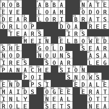 ACROSS 1. Director Reiner 4. Swedish rock group 8. Nathan's nickname 12. Night before a holiday 13. Rich soil 14. Aroma 15. Letter starter 17. Australian parrot (variant) 18. Naughty children 19. Lowest deck of a ship 21. ___ good deed 23. To sift 24. Pulls into pieces 26. Big collection agency 28. Chow _ 30. Shoved, as through a crowd 34. A female animal or person 37. Precious metal 39. Burn superficially 40. Dreamland 41. Parts of speech 43. White ___ sheet 44. Angers 46. Fly high 47. Part of a journey 48. Flamboyance 51. The Jewish people; Israel 54. Luau course 55. Overwhelms 58. Conclude 61. Air pressure measure (abbr.) 63. Peak District village in England 65. Women servants 67. Double curve, resembling the letter S 71. Part of Q.E.F. 72. Inwardly 73. Actress Patricia 74. Baseball player Mel 75. Hero or heavy, e.g. 76. Arranges properly for use 77. Teachers' org. DOWN 1. Do over again 2. Unconcealed 3. Calif. Air Force Base 4. Everything 5. Surprise greeting 6. Oblong piece of solid material 7. Among 8. Not either 9. The sixth month of the Jewish calendar 10. Carry 11. Celtic language 16. Wander 18. Sharp remark 20. Before (prefix) 22. Petroleum 25. Signal 27. Mayday 29. Trap for birds or small mammals 30. Ferber et al. 31. Welt 32. Relaxation 33. To trail on the ground 34. Sever or remove by pinching or nipping 35. Israeli folk dance 36. Locale of original sin 38. Nilotic language 42. Indian titles of respect 45. Plant excrement 49. 911 reaches them 50. Part of HMS, perhaps 52. Single 53. Connecting point 56. Make _____ (do battle with) 57. Schedule 58. Independent ruler or chieftain 59. Billionth: prefix 60. Deli pickle 62. Charged atoms 64. Singer James 66. Color 68. Turn to the right 69. Erode 70. Raised railways