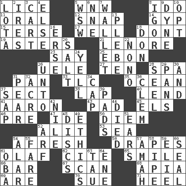 ACROSS 1. Louse (plural) 5. Compass dir. 8. Wedding promise 11. Spoken 12. Fastener 14. Con 15. Laconic 17. Water source 18. Do not 19. Michaelmas daisies 21. Poe poem 23. Declare 25. Inky black, to poets 26. Ubangi River tributary 27. Nine, plus one 28. Health resort 31. Baking dish 33. Affectionate concern, for short 35. Sea 37. Religious group 38. Infant locale 40. Grant temporary use of 41. Composer Copland 43. Writing tablet 45. Raised railways 46. Before (prefix) 47. Binary compound 50. South Vietnam president (1954) 52. Came down and settled, as after flight 53. Ocean 54. Anew 56. Window treatments 61. Norwegian king 62. Quote 65. Grin 66. Drinking establishment 67. Glance over 68. Capital of Western Samoa 69. "We ___ not amused" (Victoria) 70. Institute legal proceedings 71. Person who is morally reprehensible DOWN 1. Globular water bottle used in Asia 2. Angers 3. Haul 4. Otherwise 5. Compass dir. 6. Compass dir. 7. Place for singles 8. Russian composer Stravinsky 9. Unit of force 10. Elect 13. First-year military academy student 16. Celtic language 18. Spanish title 20. Table seasoning 22. Words to Nanette 24. Shout 26. To (old English) 28. Stitch closed the eyes of (a falcon) 29. Zero-star reviews 30. Also 31. Lightbulb-shaped fruit 32. 43,560 square feet 34. Head covering 36. Clement's nick name 37. Plant excrement 39. Groovy apts. 42. "Death on the ____" 44. Passed on 48. Plates 49. Principles of right and wrong 51. Hearing organs 52. Sandy's bark 54. Having or resembling wings 55. Conductor's collection 57. Nanny 58. Corncob 59. Writer Wiesel 60. Lick closed 61. Chief or king in Benin or Nigeria 63. The 19th letter of the Greek alphabet 64. Compass dir.