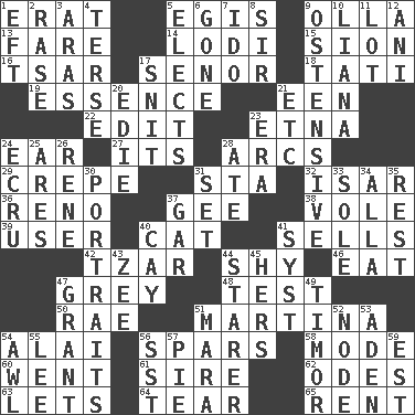 ACROSS 1. Part of Q.E.F. 5. Armor plate that protects the chest 9. Spanish pot 13. Conductor's collection 14. Farming town in central California 15. The Jewish people; Israel 16. Russian ruler of old 17. Sir (Sp.) 18. Jacques of French films 19. Center 21. Car or cant ending 22. Prepare for publication 23. Inactive volcano in Sicily 24. Ewer handle 27. It is 28. Arches 29. Streamer paper 31. R.R. building 32. Austrian river, tributary to the Danube 36. Former U.S. Attorney General Janet 37. Unit of force equal to gravity 38. Grand slam 39. One who uses or employs something 40. Domesticated feline 41. Exchanges for money 42. Russian ruler 44. Like a shrinking violet 46. Ingest 47. Jennifer or Joel 48. Trial 50. Actress Charlotte 51. Chrissie's court nemesis 54. Jai _ 56. Practice fights 58. Method 60. Left 61. Father 62. Lyric poems 63. Allows 64. Pull apart 65. Monthly bill DOWN 1. Lizard (obsolete) 2. To erase 3. Ancient river in northeast Turkey 4. Laconic 5. Opts 6. Went 7. Wedding promise 8. Title for a knight 9. Clearly or manifestly demonstrative 10. Climbing, woody, usually tropical vines 11. Car dealer's back yard 12. Cuckoo 17. In a ____ (agitated or irritated) 20. Singer Brickell 21. And so on (abbr.) 23. Epoch 24. Shade of tan 25. Ancient Greek god of war 26. French philosopher Descartes 28. Had dinner 30. Likenesses of persons 31. Put into a specified state 33. Not divided or shared with others 34. Silent film actress Nazimova 35. Repose 37. Slender fish 40. Island 41. System (abbr.) 43. Last letter of the English alphabet 44. A viewer who gazes fixedly 45. Possessive pronoun 47. Let have 49. Southeast Indonesia island 51. Hindu Mythology: god of death 52. Thickened enlargement 53. Arabian gulf 54. Leather borer 55. Area sheltered from the wind 56. Fast jet (abbr.) 57. Sliced dessert 59. Eastern Standard Time (abbr.)