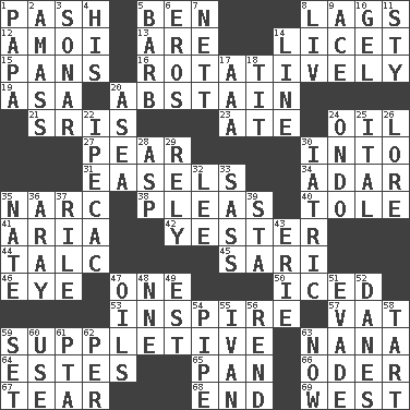 ACROSS 1. Romantic infatuation 5. Benjamin's nick name 8. Straggles 12. Mine, in Marseilles 13. "We ___ not amused" (Victoria) 14. It is permitted: Lat. 15. Zero-star reviews 16. Rotating or pertaining to rotation 19. White ___ sheet 20. Refrain by choice 21. Indian titles of respect 23. Had dinner 24. Petroleum 27. Lightbulb-shaped fruit 30. To the inside or interior of 31. Artist's stands 34. The sixth month of the Jewish calendar 35. Drug cop 38. Entreaties 40. Lacquered or enameled metalware 41. Operatic vocal solo 42. Of or pertaining to yesterday 44. Baby powder 45. Indian skirt 46. Sight organ 47. Single 50. On the rocks 53. Motivate 57. Large container 59. Supplying deficiencies 63. Nanny 64. _____ Park, CO 65. Baking dish 66. Baltic tributary 67. Lacerate 68. Conclusion 69. 270 degrees DOWN 1. Dad 2. Collect or gather 3. Echolocation 4. Part of HMS, perhaps 5. Sharp remark 6. Greek god of love 7. Remaining after all deductions 8. 54 in ancient Rome 9. Adept person 10. Set 11. Filthy place 14. Actor's bit 17. Auto club (abbr.) 18. Teat (slang) 20. At sea 22. Medicinal drug used to evoke vomiting 24. Southwest Nigerian state 25. Slanted text style (abbr.) 26. Old wives' tales, e.g. 28. Viper 29. Have trust in 30. Of or pertaining to medicine 32. Area sheltered from the wind 33. Backtalk 35. Nathan's nickname 36. Like ___ of sunshine 37. Cause heat under the collar 39. R.R. building 43. One of the Great Lakes 47. Lubricates 48. Compass dir. 49. Eastern Standard Time (abbr.) 51. Elude 52. Natives or inhabitants of Denmark 54. Corncob 55. "Terrible" tsar 56. Tear apart 58. Small pie 59. Arrange properly for use 60. Purpose 61. Parent Teacher Association (abbr.) 62. For each 63. At this time