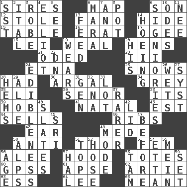 ACROSS 1. Fathers 6. Atlas unit 9. Manchild 12. Fur scarf 13. Papal veil 14. Flintstone garb 15. Eating place 16. Part of Q.E.F. 17. Double curve, resembling the letter S 18. Flowery wreath 19. Welt 20. Coop moms 21. Wrote a lyric poem 23. One more than two 24. Inactive volcano in Sicily 25. Frozen precipitation (plural) 28. Possessed 30. Therefore, facetiously 34. Jennifer or Joel 35. Connecticut Ivy Leaguer 36. Sir (Sp.) 38. ___ a Wonderful Life 39. Crowds into 41. Relating to or accompanying birth 43. Eastern Standard Time (abbr.) 44. Makes a sale 46. Chest bones 48. Hearing organ 49. Ancient Persian 50. Against 51. Son of Odin 53. Opposite of masc. 56. Toward shelter 57. Parka part 58. Hauls 60. Global Positioning Systems (abbr.) 61. Domed church section 62. Nick name for Arthur 63. Double-curved letter 64. Area sheltered from the wind 65. Intended DOWN 1. Fast jet (abbr.) 2. Slanted text style (abbr.) 3. Loose flowing garment 4. American author Paul (1891-1958) 5. Observe 6. Hindu Mythology: god of death 7. Of or related to the anus 8. Cooking vessel 9. Seigniories (variant) 10. Lyric poems 11. Born 13. Nourish 14. Cultivating 19. Erodes 20. Part of HMS, perhaps 22. Heredity factor (abbr.) 24. The property of being fit to eat 26. Soaks 27. System (abbr.) 28. Is hesitant and indecisive 29. _ vera 31. Commissioned mil. rank 32. Santa ___, CA 33. Car dealer's back yard 37. Less widely known 40. Chalkboards 42. Hat (slang) 45. _ Lanka 47. Prior to 49. Method 50. High mountains 51. Drink excessively 52. Stockings 54. Singer James 55. Chow _ 56. Grow older 57. Actor Linden 58. Scottish cap 59. Put into a specified state
