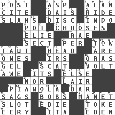 ACROSS 1. Mail 5. Cleo's killer 8. Actor Alda or Thicke 12. Quote 13. Raised platform 15. Travel on or in a vehicle 16. Shuts with force 18. Compact _ 19. _ china 20. Cooking vessel 22. Elects 24. Writer Wiesel 26. Actress Charlotte 27. Religious group 28. For each 29. Pull behind 32. Pulled tight 35. Froth on beer 37. "We ___ not amused" (Victoria) 38. Singles 39. Big collection agency 40. Mouths or openings 41. Set 42. Scram! 43. Electrical Unit 44. Deep reverence 45. ___ a Wonderful Life 46. Otherwise 49. Not either 50. Den 51. Player piano 55. Tavern 56. Sinks 57. Moves up and down 59. French painter Edouard 63. Position in a hierarchy or organization 64. Singer Brickell 65. Puff or smoke 66. Suggestive of the supernatural 67. Call ___ day 68. Locale of original sin DOWN 1. Personal Computers (abbr.) 2. Lubricate 3. R.R. building 4. Storms 5. Increase 6. Ketch in the Levant 7. Expression of disdain 8. Originate 9. Actor's bit 10. Sums up 11. Modern: prefix 14. Tallied 17. Flatfish 21. Nervous spasm 23. Rowing implement 25. Value system 28. Soft color 29. Edible starchy tuberous root 30. Relating to the mouth 31. 270 degrees 32. Ancient Roman robe 33. Afresh 34. Ubangi River tributary 36. Period 40. Make much ado about nothing 42. Disco prop 45. Electrically charged atom 47. Experiment locale 48. Thailand, formerly 49. Smutty 51. Light colored 52. Composer Stravinsky 53. Farming town in central California 54. "This won't hurt ____!" 56. Compass dir. 58. Ocean 60. Lower and raise head in agreement 61. Make supply last 62. Nine, plus one