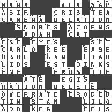 ACROSS 1. Hindu Mythology: god of death 5. Wing 8. Plant excrement 11. SW Saudi Arabia district 12. Baby bed with high sides 13. Beverage made from leaves 14. Device for capturing images 17. Accusation by an informer 19. Sounds asleep 21. Oak nuts 22. First man 23. Domesticated feline 24. Compass dir. 27. Snake ____ (dice throw) 29. Put into a specified state 32. Monte _, Las Vegas Hotel/Casino 34. To separate or throw off 36. Relaxation 37. Mitch Miller's instrument 38. Separate the seeds from cotton 39. One who doesn't tell the truth 40. Flaplike coverings 41. Eastern Standard Time (abbr.) 42. Pig sounds 43. Compass dir. 44. Greek god of love 46. Neckwear 47. Had dinner 50. Armor plate that protects the chest 52. Food allowance for one day 55. Erase 57. Make much ado about nothing 59. Eaten away 62. Shallow baking pan 63. Comedian Laurel of Laurel & Hardy 64. _ and Stitch 65. Find the sum of 66. Barrel 67. Snakelike fish DOWN 1. Apple computer (short form) 2. White ___ sheet 3. Basketball hoops 4. Sports stadium 5. "We ___ not amused" (Victoria) 6. Pale purple color 7. Phillipine bananalike plant 8. Commotion 9. A really long time 10. Baking dishes 12. Music discs 15. Cowboy competition 16. Like ___ of sunshine 18. Small child 20. Develop 24. Learning spot: Fr. 25. Unit of acoustic absorption 26. Wear away 28. Gospel singer Marvin 29. Virtuous person 30. 1973 Nobel Price Winner (Physics) Leo 31. Laconic 33. French article 35. Main course 36. Connecticut Ivy Leaguer 42. Flexible twig of a willow tree 45. Stare at amorously 47. Wind 48. Cod relative 49. Related on the mother's side 51. Took without asking 52. Roll call or roster of names 53. Enthusiastic 54. Watch over 55. Lair 56. Singer Brickell 58. Label 60. Pipe bend 61. Two (Sp.)