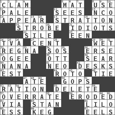 ACROSS 1. Burrowing marine mollusk 5. Floor covering 8. Purpose 11. Diluted with white 12. Observes 13. Non-commissioned officer (abbr.) 14. Seem 17. Ski resort town in Vermont 19. Disco prop 21. Foolish or stupid persons 22. Drop; flow; fall 23. Car or cant ending 24. Federal power corp. 27. Penny 29. Soggy 32. Rain (Swedish) 34. Mayday 36. Celtic language 37. Double curve, resembling the letter S 38. Baseball player Mel 39. Wither 40. Grandmother 41. Modern: prefix 42. Writing tables 43. Eastern Standard Time (abbr.) 44. Printing process, for short 46. Neckwear 47. Had dinner 50. Republicans 52. Food allowance for one day 55. Keyboard key 57. Make much ado about nothing 59. Worn away 62. By way of 63. Comedian Laurel of Laurel & Hardy 64. _ and Stitch 65. Double-curved letter 66. Barrel 67. Snakelike fish DOWN 1. Accounting whiz (abbr.) 2. Pet locale 3. High mountains 4. Confronts 5. Was introduced to 6. Nest on high 7. Sadhe (variant) 8. To (old English) 9. Highlander 10. Immeasurably long periods of time 12. Compass dir. 15. N. Chile seaport 16. Hero or heavy, e.g. 18. Shallow baking pan 20. Gillaume's butler role 24. Heavy duty weighing machine 25. Viva Las _ 26. Representative 28. Carrier 29. Obtain by seizing forcibly or violently 30. 1973 Nobel Price Winner (Physics) Leo 31. Laconic 33. Teachers' org. 35. Moe Howard, for one 36. Compass dir. 42. Drug addict 45. Lacquered or enameled metalware 47. Atmosphere 48. Cod relative 49. Related on the mother's side 51. Took without asking 52. Be footloose 53. Advice 54. Beverages made from leaves 55. Lair 56. Singer Brickell 58. Label 60. Pipe bend 61. Two (Sp.)
