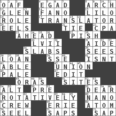 ACROSS 1. Clumsy lout 4. Mild oath 8. Bowlike part 12. Small, secluded valley 14. Papal veil 15. _ and Stitch 16. Hero or heavy, e.g. 17. Interpreter 20. Snakelike fish 21. Make a knot 22. Tax preparer (abbr.) 23. Toward the future 27. Expression of disdain 29. 57 in ancient Rome 31. Assistant 34. Broad, flat, thick pieces 35. Observes 36. Grant temporary use of 39. Compass dir. 41. Is not 42. Competent 43. The state of being joined or united 46. Light colored 47. Prepare for publication 48. Mouths or openings 51. Settings 54. Keyboard modifier key 56. Before (prefix) 58. Letter starter 61. Producing rotation 66. Billionth: prefix 67. Ship's personnel 68. One of the Great Lakes 69. Smallest unit of an element 70. Sew up the eyelids of hawks and falcons 71. Plant excrements 72. Plant excrement DOWN 1. Legendary monster 2. Medicinal plant 3. Chap (slang) 4. Bank Draft (abbr.) 5. Slender fish 6. Santa ___, CA 7. Do not 8. Insect wing 9. Actors Guy, Robert Welles, and Clint 10. Hoof sound 11. Israeli folk dance 13. Delicate 18. Small drink 19. Luau accessory 24. Pipe bend 25. Actress Gardner 26. Rights 28. Indian antelope 30. Come out of 32. Lair 33. Eastern Standard Time (abbr.) 34. Scornful expression 36. Infant locale 37. Chief or king in Benin or Nigeria 38. One to whom something is allotted 40. Extremities 44. One more than two 45. Baseball player Mel 49. Fitting 50. _ Lanka 52. Pulitzer Prize-winning author Ferber 53. Theater features 54. Curves 55. Old wives' tales, e.g. 57. Nights before holidays 59. Small Philippine buffalo 60. Play 62. Leather borer 63. Epoch 64. Mouth edge 65. Affirmative reply
