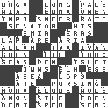ACROSS 1. Capital and largest city of Mongolia 5. Protracted 9. Light colored 13. Monetary unit of Yemen 14. Pulitzer Prize-winning author Ferber 15. Sign of something about to happen 16. Body of Kaffir warriors 17. Scornful expression 18. Assign a rank or rating to 19. Elected representative 21. Mountains (abbr.) 22. Arab leader 23. Blunders 24. Pet locale 27. "We ___ not amused" (Victoria) 28. Roberta Peters solo 29. Assad's deity 31. Federal power corp. 32. _ the terrible 36. Moves 37. Falsehood 38. "Corrida" creature 39. Oceans 40. Lair 41. Small island 42. Lodging establishments 44. Shade tree 46. Compass dir. 47. Toward the sea 48. Chops off 50. Had dinner 51. Puckering 54. Israeli folk dance 56. Evade 58. Hero or heavy, e.g. 60. At once, immediately (arch.) 61. Filth; sediment 62. Genesis locale 63. Gouge 64. Broke a traffic law 65. Transmit DOWN 1. RI univ. 2. Basketball hoops 3. Stare wonderingly 4. Place in a line 5. Poe poem 6. River in Europe 7. Compass dir. 8. Slender fish 9. Likenesses of persons 10. Collect or gather 11. Allow 12. Compass dir. 17. Disorderly outburst 20. Nanny 21. Medical imaging device (abbr.) 23. Period 24. Straggles 25. _ vera 26. Entreaty 28. "___ Maria" 30. Helper 31. Shallow baking pan 33. Grand slam 34. Ancient Greek god of war 35. Brief written record 37. French article 40. Heredity factor (abbr.) 41. Naughty children 43. Born 44. Evaded 45. Old wives' tales, e.g. 47. Composer Copland 49. Begets 51. Whine 52. Connecting point 53. Small, secluded valley 54. Possessed 55. Single 56. Double-curved letter 57. Mouth edge 59. Conclude