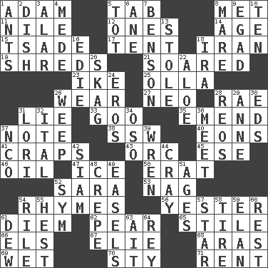 ACROSS 1. First man 5. Bar bill 8. Was introduced to 11. Mediterranean tributary 12. Singles 14. Personal question 15. Sadhe (variant) 17. Portable shelter 18. SW Asia republic 19. Tears up 21. Flew 23. D.D.E's nickname 25. Water jar 26. Put on (as clothing) 27. Modern: prefix 28. Actress Charlotte 31. Falsehood 33. Thick or sticky substance 35. Make improvements or corrections to 37. Brief written record 38. Compass dir. 40. Immeasurably long periods of time 41. Dice game 43. The grampus (Milton) 45. Compass dir. 46. Petroleum 47. Frozen water 50. Part of Q.E.F. 52. "Two Mules for Sister ____" 53. Tired old horse 54. Poems 56. Next before 61. South Vietnam president (1954) 62. Lightbulb-shaped fruit 65. Vertical member of a panel or frame 66. Raised railways 67. Writer Wiesel 68. Caspian sea tributary 69. Dripping 70. Filthy place 71. Monthly bill DOWN 1. Pismires 2. Food container 3. Having or resembling wings 4. Ancient Persian 5. Small child 6. A saturated hydrocarbon 7. Gillaume's butler role 8. Female horse 9. Mild oath 10. Nine, plus one 13. Fur scarf 16. Singer Brickell 18. Lyricist Gershwin 20. Heroin 22. _ vera 24. Greek god of love 26. Shed a tear 28. Vintage cars 29. Singer Murray 30. Begley and Asner 31. Australian parrot (variant) 32. Slanted text style (abbr.) 34. Bear (Spanish) 36. Rendezvous 37. Non-commissioned officer (abbr.) 39. Songbird 42. Thailand, formerly 44. Supercomputer manufacturer 48. Streamer paper 49. Artist's stands 51. Eras 52. Symbol (abbr.) 54. Cause heat under the collar 55. Command 57. Play the lead 58. Become fatigued 59. Style 60. Relief 61. Morning condensation 63. Small island 64. Marina Del _, California