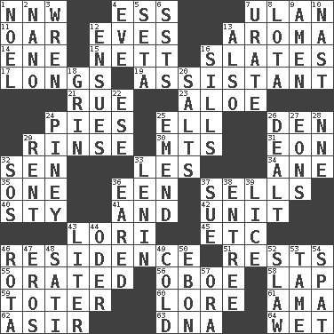 ACROSS 1. Compass dir. 4. Double-curved letter 7. Uhlan (variant) 11. Rowing implement 12. Nights before holidays 13. Scent 14. Compass dir. 15. Remaining after all deductions 16. Chalkboards 17. Yearns 19. Aide 21. Sorrow 23. Medicinal plant 24. Sliced desserts 25. Pipe bend 26. Lair 29. Remove soap 30. Mountains (abbr.) 31. Period of immesurable duration 32. Elected rep. 33. French article 34. A saturated hydrocarbon 35. Single 36. Car or cant ending 37. Exchanges for money 40. Filthy place 41. Added to 42. A single undivided whole 43. Australian parrot (variant) 45. And so on (abbr.) 46. Home 51. Musical pauses 55. Declaimed 56. Mitch Miller's instrument 58. Pet locale 59. Carrier 60. Old wives' tales, e.g. 61. Wet nurse (var.) 62. SW Saudi Arabia district 63. Heredity factor (abbr.) 64. Dripping DOWN 1. Christmas carol 2. Billionth: prefix 3. Songbird 4. First lady 5. Bristle 6. Fast planes 7. A salt of uric acid 8. Globular water bottle used in Asia 9. So be it 10. Political cartoonist Thomas 12. Follows as a consequence or result 13. In addition 16. Beverly of Met fame 18. Broad smile 20. Table seasonings 22. Compass dir. 24. Abounding in pines 25. Make improvements or corrections to 26. Started a card game 27. Immeasurably long periods of time 28. Compass dir. 29. Monthly bill 32. Mayday 33. Soviet premier 1918-24 36. Having ears or earlike features 37. Institute legal proceedings 38. Main course 39. Louse (plural) 43. 61 cubic inches 44. Baltic tributary 46. Round or rotation of duties 47. Greek god of love 48. Suttee (variant) 49. Lacking warmth 50. Inky black, to poets 52. Cole _ (cabbage dish) 53. Docile 54. Argument over a trivial matter 57. Mouth or opening