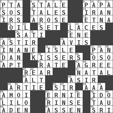 ACROSS 1. Parent Teacher Assoc. 4. Lacking originality or spontaneity 9. Dad 13. Distress signal 14. Lies 15. SW Asia republic 16. Big collection agency 17. Came up 18. Inactive volcano in Sicily 19. Lubricate 21. Put into a specified state 22. Shoestrings 24. Suttee (variant) 26. Compass dir. 27. Having gotten out of bed 29. Opinion 30. Silly 31. Small island 33. Baking dish 36. One of the 12 tribes of Israel 37. Smoochers 40. Bear (Spanish) 41. Fitting 42. Assign a rank or rating to 43. Match 45. Tail end 47. Relating to or accompanying birth 48. The first octave above the treble staff 49. SW Saudi Arabia district 50. Nick name for Arthur 52. Title for a knight 54. Auto club (abbr.) 56. Mine, in Marseilles 57. Bert's buddy 59. Wedding promise 61. _ and Stitch 62. Wash lightly 63. The 19th letter of the Greek alphabet 64. Arabian gulf 65. NE Netherlands city 66. Indian title of respect (Mr.) DOWN 1. Air pressure measure (abbr.) 2. "Corrida" creature 3. Aide 4. R.R. building 5. Tarsus (plural) 6. Medicinal plant 7. For fear that 8. Compass dir. 9. Components 10. Johnson of "Laugh-In" 11. Baking dishes 12. Santa ___, CA 20. (Had) reclined 22. Crowbar 23. Black tropical American cuckoo 25. Long journey 27. Opera by Verdi 28. Fastener 29. Toward shelter 31. Austrian river, tributary to the Danube 32. Fast jet (abbr.) 33. Likenesses of persons 34. At sea 35. Christmas carol 38. Feeling or showing extreme anger 39. Without 44. Greek goddess of the earth (variant) 45. Food allowance for one day 46. Biblical high priest 49. Get up 50. Among 51. Hero or heavy, e.g. 52. Indian titles of respect 53. Taverns 55. The sixth month of the Jewish calendar 56. Wing 57. Period 58. Car or cant ending 60. Fr. "Yes"