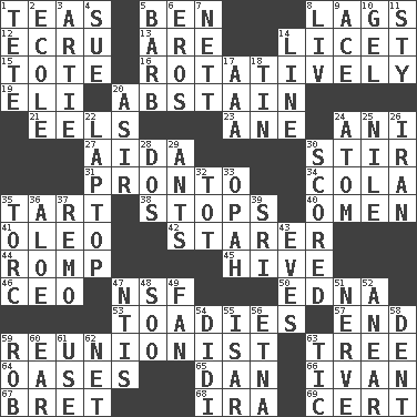 ACROSS 1. Beverages made from leaves 5. Benjamin's nick name 8. Falls behind 12. Shade of tan 13. "We ___ not amused" (Victoria) 14. It is permitted: Lat. 15. Carry 16. Rotating or pertaining to rotation 19. Biblical high priest 20. Refrain by choice 21. Snakelike fish 23. A saturated hydrocarbon 24. Black tropical American cuckoo 27. Opera by Verdi 30. Use a spoon 31. Right away 34. Root beer relative 35. Small pie 38. Halts 40. Sign of something about to happen 41. Butter sub 42. A viewer who gazes fixedly 44. Frolic 45. Hub of activity 46. Corporate head (abbr.) 47. Overdraft (abbr.) 50. Pulitzer Prize-winning author Ferber 53. Sycophants 57. Conclusion 59. One who advocates reunion 63. Family _ (genealogy) 64. Fertile tracts in a desert 65. One of the 12 tribes of Israel 66. "Terrible" tsar 67. Cy Young winner Saberhagen 68. Retirement account (abbr.) 69. Foregone conclusion DOWN 1. False hair 2. Learning spot: Fr. 3. Nick name for Arthur 4. Take to court 5. Sharp remark 6. Greek god of love 7. Remaining after all deductions 8. 54 in ancient Rome 9. Adept person 10. Set 11. Filthy place 14. Actor's bit 17. American Automobile Association (abbr.) 18. Metal container 20. SW Saudi Arabia district 22. Portable computer 24. Smallest unit of an element 25. Mediterranean tributary 26. SW Asia republic 28. Two (Sp.) 29. Pismires 30. Tallied 32. Small child 33. Brightly colored fish 35. Torque (variant) 36. Medicinal plant 37. San ____ (Riviera town) 39. Indian title of respect (Mr.) 43. Nights before holidays 47. Nuclear Threat Initiatives 48. "Barney Miller" actor Jack 49. Avid follower 51. Boldness 52. Approach 54. "You Light Up My Life" star Conn 55. Austrian river, tributary to the Danube 56. Inactive volcano in Sicily 58. Gouge 59. Director Reiner 60. Hearing organ 61. Purpose 62. Fish or hair follower 63. Nervous spasm