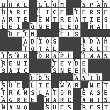 ACROSS 1. Mountain range 5. Take by theft 9. Connect, as a bridge 13. Have the gumption 14. Louse (plural) 15. Laconic 16. Johnson of "Laugh-In" 17. Pleas 19. Flowery wreath 20. Single 21. Directed 22. Floor protector 23. It's straight from the horse's mouth 25. Raised railways 26. Goodbye (Sp.) 30. First man 34. "_____ Recall" 35. Table seasoning 36. Austrian river, tributary to the Danube 39. Window treatment 42. It was, poetically 43. Painter Guido (1575-1642) 44. Miss Universe 1986, Barbara Palacios _ 46. Ketch in the Levant 47. Contemptuous expression 48. Greek goddess of the dawn 51. SW Saudi Arabia district 54. Institute legal proceedings 57. Untruth 58. Armed conflict 60. Fish or hair follower 62. Interpreter 65. Comfort 66. Match 67. Drug cop 68. Pismires 69. Billionth: prefix 70. Institutes legal proceedings 71. State of inaction DOWN 1. Allodial 2. More valued for its uncommonness 3. Nick name for Arthur 4. Area sheltered from the wind 5. Small, secluded valley 6. Actor's bit 7. Sep. follower 8. Haggard of country music 9. Put into a specified state 10. Demure 11. At sea 12. A home for chicks 15. Small amounts or degrees 18. Snakelike fish 20. Southwest Nigerian state 24. Of or pertaining to medicine 27. It would 28. Rowing implement 29. Narrow boards 30. Michaelmas daisies 31. Simpleton 32. Insect wing 33. Mountains (abbr.) 36. Big collection agency 37. Ocean 38. Black tropical American cuckoo 40. Writing instrument 41. Sight organ 45. Letter starter 48. Otherwise 49. Lubricate 50. Actors Connery and Penn 52. Lacking in sense or substance 53. Musical pauses 54. Comedian Laurel of Laurel & Hardy 55. Capital and largest city of Mongolia 56. Merit 58. Had on 59. Curves 61. Trial 63. Modern: prefix 64. The 19th letter of the Greek alphabet 65. Ewer handle