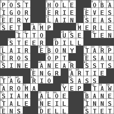 ACROSS 1. Mail 5. Hollow 9. Chief or king in Benin or Nigeria 12. Composer Stravinsky 13. 4th largest of the Great Lakes 14. Nights before holidays 15. Suggestive of the supernatural 16. (Had) reclined 17. Oceans 18. Put into a specified state 19. Electrical Unit 21. Haggard of country music 22. "Tell ____ the Marines!" 24. Purpose 26. Nine, plus one 27. Guide 28. Deli pickle 29. Den 30. Black 32. Canvas cover 36. Greek god of love 37. Choose 38. Son of Isaac 39. Trig term 40. Approach 42. Fast planes 43. Engineer (abbr.) 44. Nick name for Arthur 46. Label 49. River (Sp.) 50. Backtalk 51. Odor 53. Slangy assent 54. The 23rd letter of the Hebrew alphabet 57. Thailand, formerly 58. Medicinal plant 61. Object of repulsion 62. Story 63. Famous astronaut Armstrong 64. Taverns 65. Followers of ems 66. Small valley 67. Proofreading order DOWN 1. Sliced desserts 2. Double curve, resembling the letter S 3. Casting lots 4. Attempt 5. Aid 6. Mouth or opening 7. Cards in a Roman deck? 8. Car or cant ending 9. Unconcealed 10. Memphis, Tenn. Street 11. NE Netherlands city 14. Compass dir. 19. Had dinner 20. Greater amount 21. Cartoonist voice _ Blanc 23. Laconic 24. National forest in Provo, Utah 25. Stealthy 27. Indian skirt 28. Drug addict 29. French article 31. Beat drum 32. Trials 33. Aide 34. Assign a rank or rating to 35. Ichor 40. Black tropical American cuckoo 41. To erase 43. Epoch 45. Strike 46. Clothes sense 47. Believer in; advocate of (suffix) 48. Purposes of endeavors 52. Madame (abbr.) 53. Shout 55. Queen of England 1702-14 56. 270 degrees 58. Added to 59. Area sheltered from the wind 60. Lubricate 61. Altar cloth linen