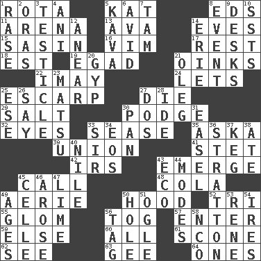 ACROSS 1. Round or rotation of duties 5. Krazy ___ of comics 8. Begley and Asner 11. Sports stadium 13. Actress Gardner 14. Nights before holidays 15. Indian antelope 16. Zeal 17. Respite 18. Eastern Standard Time (abbr.) 19. Mild oath 21. Pig sounds 22. "If ____ say so..." 24. Allows 25. Fortification 27. Expire 29. Table seasoning 30. Porridge 32. Sight organs 33. Gospel singer Marvin 35. "____ silly question..." 39. The state of being joined or united 41. Proofreading order 42. Big collection agency 43. Develop 45. Give a ring to 48. Root beer relative 49. Nest on high 50. Parka part 52. Three (prefix) 55. Take by theft 56. Coat; cloak 57. Keyboard key 59. Otherwise 60. 100% 61. Biscuitlike quick bread 62. Observe 63. Turn to the right 64. Singles DOWN 1. To erase 2. Mouths or openings 3. One of the two male reproductive glands 4. Black tropical American cuckoo 5. Polynesian shrub of the pepper family 6. Enthusiastic 7. Scottish cap 8. Happening 9. Writing tables 10. Fast planes 12. Approach 14. One of the Great Lakes 20. Flimflam 21. Cassini of fashion 23. Taiwanese island in East China Sea 25. Compass dir. 26. Declare 27. Two (Sp.) 28. Binary compound 30. Baking dish 31. Artist's stand 33. Title for a knight 34. Greek goddess of the dawn 36. Ski resort town in Vermont 37. Barrel 38. Had dinner 40. The longest river in the world 43. Environmental prefix 44. Methods 45. Cell (Danish) 46. Came up 47. Welles in "The Third Man" 49. Eras 50. Hollow 51. Stare at amorously 53. French philosopher Descartes 54. Angers 56. Label 58. Non-commissioned officer (abbr.)