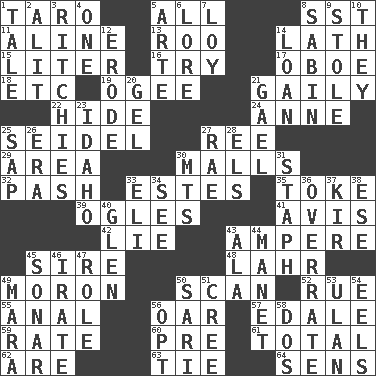 ACROSS 1. Pacific island yam 5. 100% 8. Fast jet (abbr.) 11. Place in a line 13. Friend of Pooh 14. Thin strip of wood or metal 15. 61 cubic inches 16. Attempt 17. Mitch Miller's instrument 18. And so on (abbr.) 19. Double curve, resembling the letter S 21. Lightheartedly 22. Flintstone garb 24. Singer Murray 25. Beer mug 27. To riddle 29. Type of rug 30. Shopping centers 32. Romantic infatuation 33. _____ Park, CO 35. Puff or smoke 39. Stares 41. Deliberation 42. Falsehood 43. Electrical Unit 45. Father 48. Cowardly lion portrayer 49. Person of subnormal intelligence 50. Glance over 52. Sorrow 55. Of or related to the anus 56. Rowing implement 57. Peak District village in England 59. Pace 60. Before (prefix) 61. "_____ Recall" 62. "We ___ not amused" (Victoria) 63. Standoff 64. Elected reps. DOWN 1. Lie 2. Set down 3. Actors Guy, Robert Welles, and Clint 4. Single 5. Johnson of "Laugh-In" 6. Old wives' tales, e.g. 7. Myrna of the movies 8. Unit of acoustic absorption 9. Fur scarf 10. Those people 12. Wear away 14. Grant temporary use of 20. Set 21. Highlander 23. Potato state 25. Plant excrement 26. Epoch 27. Actress Charlotte 28. Raised railways 30. Mountains (abbr.) 31. Staphylococcus 33. Biblical high priest 34. Perceive with the eye 36. Make much ado about nothing 37. Apertif with cassis 38. Compass dir. 40. Small, secluded valley 43. Chicken ___ king 44. French painter Edouard 45. Echolocation 46. Feeling or showing extreme anger 47. Hero or heavy, e.g. 49. Hindu Mythology: god of death 50. Indian skirt 51. Algonquian 53. ____ Bator 54. Snakelike fish 56. Choose 58. Two (Sp.)