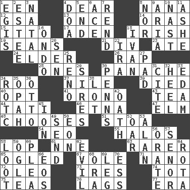 ACROSS 1. Car or cant ending 4. Letter starter 8. Grandmother 12. Girls' org. (abbr.) 13. Single time 14. Mouths or openings 15. "Tell ____ the Marines!" 17. Arabian gulf 18. From or relating to Ireland 19. Seines 21. HTML Container Element 23. Had dinner 24. A person who is older than you are 26. Strike 28. Singles 30. Flamboyance 34. Friend of Pooh 37. The longest river in the world 39. Passed on 40. Choose 41. U. of Maine site 43. Afternoon social gathering 44. Jacques of French films 46. Inactive volcano in Sicily 47. Shade tree 48. Opts 51. Portico 54. Modern: prefix 55. Saint headwear 58. Chop off 61. Compass dir. 63. More valued for its uncommonness 65. Stared 67. Short-tailed, large-bodied rat 71. Billionth: prefix 72. Butter sub 73. Angers 74. Small child 75. Afternoon social gatherings 76. Fails to keep up a pace 77. Epoch DOWN 1. Armor plate that protects the chest 2. First name in cosmetics 3. Brizilian seaport 4. ___ good deed 5. Conclude 6. Adept person 7. Tear apart 8. Not either 9. Operatic vocal solo 10. Political cartoonist Thomas 11. American tennis player Robert 16. Southwest Nigerian state 18. _ the terrible 20. Elected rep. 22. Lyricist Gershwin 25. Former U.S. Attorney General Janet 27. Writing tablet 29. Male parents of animals 30. Actor Sean's family 31. Quote 32. The bottom of a shoe or boot 33. Dutch treat 34. College mil. group 35. Brightly colored fish 36. Von Bismarck 38. Car dealer's back yard 42. Pledge 45. Electrically charged atom 49. Transmit 50. A really long time 52. Boat paddle 53. Actor Alda or Thicke 56. Declaim 57. Sir (Sp.) 58. Spoils 59. Stare 60. Entreaty 62. Morally bad or wrong 64. Roll call or roster of names 66. Greek goddess of the dawn 68. Mouth or opening 69. Part of a journey 70. Double-curved letter
