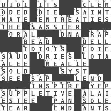 ACROSS 1. "You Light Up My Life" star Conn 5. ___ a Wonderful Life 8. To starve (Brit.) 12. Wrote a lyric poem 13. Expire 14. Virtuous person 15. Nathan's nickname 16. Pleas 19. Definite Article 20. More lively and spirited 21. Spoken 23. Heredity factor (abbr.) 24. Hit sharply and swiftly 27. Necklace unit 30. Small valley 31. Foolish or stupid persons 34. Singer Brickell 35. Saudi Arabian king (1953-1964) 38. Frees from moisture 40. Globular water bottle used in Asia 41. Toward shelter 42. Ear of corn 44. Exchanged or delivered for money 45. System (abbr.) 46. Observe 47. Plant excrement 50. Grant temporary use of 53. Heighten or intensify 57. Slangy assent 59. Supplying deficiencies 63. Jai ____ 64. First name in cosmetics 65. Baking dish 66. Flatfish 67. Pull into pieces 68. Conclude 69. Pismires DOWN 1. Do not 2. Potato state 3. Prevent from occurring 4. Binary compound 5. It may be bright or harebrained 6. Metal containers 7. Puts into a specified state 8. Feline 9. Cards in a Roman deck? 10. Compass dir. 11. Mountains (abbr.) 14. "Two Mules for Sister ____" 17. To free from 18. Car or cant ending 20. Downhill vehicle 22. Remained 24. Redecorate 25. Set down 26. Entreaty 28. Assist 29. Dormintory (informal) 30. Erase 32. Standoff 33. Oceans 35. Backtalk 36. Medicinal plant 37. Ubangi River tributary 39. Insidious 43. Small island 47. Drop; flow; fall 48. A saturated hydrocarbon 49. Pacific Standard Time (abbr.) 51. High-strength synthetic material 52. Started a card game 54. Corncob 55. _ the terrible 56. Tear apart 58. Sliced desserts 59. Put into a specified state 60. Purpose 61. Parent Teacher Association (abbr.) 62. For each 63. White ___ sheet