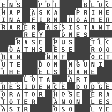 ACROSS 1. Followers of ems 4. Plant holder 7. Alliance 11. Atlas unit 12. "____ silly question..." 13. A-one 14. _ tizzy (2 wds.) 15. Not soft or yielding to pressure 16. Nomad 17. More valued for its uncommonness 19. Aide 21. Marina Del _, California 23. Singles 24. Raze (variant) 25. Tenth month of the Hindu calendar 26. Affectionate concern, for short 29. Profane or obscene expressions 30. Compass dir. 31. Friend of Pooh 32. Prohibit 33. Compass dir. 34. Sep. follower 35. Shoshoni 36. Spanish title 37. Group of southern Bantu languages 40. Definite Article 41. Raised railways 42. Object of repulsion 43. Globular water bottle used in Asia 45. Tate display 46. Dwelling 51. Evade 55. Speaker 56. Flexible conduit 58. Epoch 59. Carrier 60. At once, immediately (arch.) 61. French article 62. SW Saudi Arabia district 63. Bear (Spanish) 64. Sodium hydroxide DOWN 1. Arab leader 2. Nanny 3. Practice fight 4. Air pressure measure (abbr.) 5. Gumbo ingredient 6. Scottish caps 7. Naughty children 8. Pale green bean 9. Sign of something about to happen 10. Certainty 12. Anew 13. Introduce or present, as a question 16. Wash lightly 18. Part of Q.E.F. 20. Lush 22. It is so 24. Indian princess (variant) 25. Actor Sean's family 26. Heavy duty weighing machine 27. Event scenes 28. Small bed 29. Pledge 32. Yet 33. Pitcher Ryan 36. Prevent from occurring 37. Basketball assoc. 38. Place where plants grow 39. To (old English) 43. 61 cubic inches 44. Aroma 46. Roll call or roster of names 47. Greek god of love 48. Suttee (variant) 49. US Secretary of Labor Elaine L. _ 50. Immeasurably long periods of time 52. Small valley 53. Jennifer or Joel 54. Relaxation 57. "Barney Miller" actor Jack