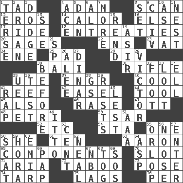 ACROSS 1. Small boy 4. First man 8. Skim 12. Greek god of love 14. Bodily heat indicating an inflammation 16. Otherwise 17. Travel on an animal 18. Pleas 20. Gurus 22. Followers of ems 23. Large container 24. Compass dir. 25. Writing tablet 28. HTML Container Element 30. Indonesian resort city 31. Firearm 35. Shoshoni 37. Engineer (abbr.) 40. Calm and collected 41. Coral ridge 42. Artist's stand 44. Implement 45. In addition 46. Raze (variant) 47. Baseball player Mel 48. _ dish (used to culture cells) 50. Russian ruler of old 52. And so on (abbr.) 54. R.R. building 55. Single 58. A female animal or person 61. "___ Little Indians" 63. Composer Copland 65. Parts 70. Groove 71. Operatic vocal solo 72. Off limits 73. Airs 74. Canvas cover 75. Fails to keep up a pace 76. For each DOWN 1. Laconic 2. Believer in; advocate of (suffix) 3. Evade 4. Adept person 5. One of the 12 tribes of Israel 6. The first octave above the treble staff 7. Greater amount 8. Arrange properly for use 9. 154 in Roman numerals 10. At sea 11. A home for chicks 13. Observe 15. Tear apart 19. SW Saudi Arabia district 21. Health resort 26. Toward shelter 27. Middle Eastern gold or silver currency 29. Winning man's name 30. Prior to 32. One third of a yard 33. Plunder 34. Pipe bend 35. Ubangi River tributary 36. Trial 38. Girls' org. (abbr.) 39. Musical pauses 41. Reproach for some lapse or misdeed 43. For fear that 49. "Tell ____ the Marines!" 51. American Automobile Association (abbr.) 53. Penny 55. Fourth or lowest deck 56. Trap for birds or small mammals 57. Keyboard key 58. Scram! 59. Israeli folk dance 60. Arab leader 62. Actress Patricia 64. Cleo's killer 66. Infant food 67. Basketball assoc. 68. Coat; cloak 69. Distress signal