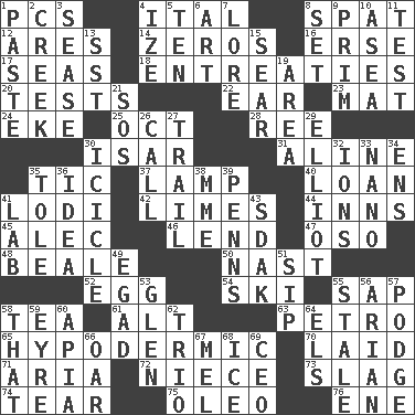 ACROSS 1. Personal Computers (abbr.) 4. Slanted text style (abbr.) 8. Petty quarrel 12. Ancient Greek god of war 14. Nothings 16. Celtic language 17. Oceans 18. Pleas 20. Trials 22. Ewer handle 23. Floor protector 24. Make supply last 25. Sep. follower 28. To sift 30. Austrian river, tributary to the Danube 31. Place in a line 35. Nervous spasm 37. Desk light 40. Grant temporary use of 41. Farming town in central California 42. Citrus fruits 44. Taverns 45. Actor Baldwin 46. Grant temporary use of 47. Bear (Spanish) 48. Memphis, Tenn. Street 50. Political cartoonist Thomas 52. Ovum 54. What Jean-Claude Killy likes to do 55. Plant excrement 58. Afternoon social gathering 61. Keyboard modifier key 63. Stone: prefix 65. Below the epidermis 70. Put down 71. Roberta Peters solo 72. Sibling's daughter 73. Volcanic refuse 74. Pull apart 75. Margarine 76. Compass dir. DOWN 1. Thick mixture 2. Small stream 3. Gospel singer Marvin 4. Ending with capital 5. "___ Little Indians" 6. Tate display 7. Old wives' tales, e.g. 8. Put into a specified state 9. Demure 10. Toward the sea 11. Trial 13. Fast jet (abbr.) 15. Burn superficially 19. Length times width 21. Mayday 26. Give a ring to 27. Get behind 29. American author Paul (1891-1958) 30. Ice on the eave 32. Charged atoms 33. Billionth: prefix 34. Followers of ems 35. Lacquered or enameled metalware 36. It may be bright or harebrained 38. Madame (abbr.) 39. Actor Sean's family 41. Experiment locale 43. Neighbor of Neb. 49. Mild oath 51. Small drink 53. Small, secluded valley 55. Showing deterioration from age 56. Believer in; advocate of (suffix) 57. Plash 58. Not this but _ 59. Jane of fiction 60. Capital of Western Samoa 62. Musical group of three 64. Raised railways 66. Rowing implement 67. Cartoonist voice _ Blanc 68. Frozen water 69. Corporate head (abbr.)