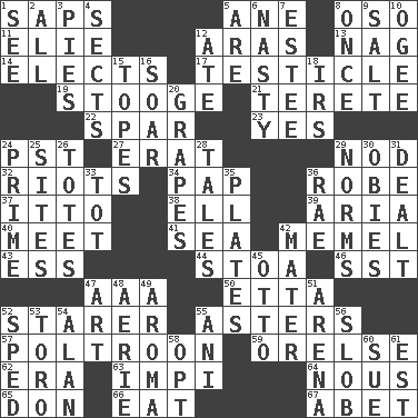 ACROSS 1. Plant excrements 5. A saturated hydrocarbon 8. Bear (Spanish) 11. Writer Wiesel 12. Caspian sea tributary 13. Tired old horse 14. Opts 17. A testis 19. Moe Howard, for one 21. Cylindrical with tapered ends 22. Coast Guard woman 23. Consenting reply 24. Pacific Standard Time (abbr.) 27. Part of Q.E.F. 29. Lower and raise head in agreement 32. Disturbances 34. Infant food 36. Loose flowing garment 37. "Tell ____ the Marines!" 38. Pipe bend 39. Roberta Peters solo 40. Rendezvous 41. Ocean 42. Klaipeda city 43. Curvy letter 44. Portico 46. Fast jet (abbr.) 47. Auto club (abbr.) 50. Singer James 52. A viewer who gazes fixedly 55. Michaelmas daisies 57. Coward 59. Threatening words 62. Period 63. Body of Kaffir warriors 64. Horse sense 65. Spanish title 66. Ingest 67. Collude with DOWN 1. Perceive with the eye 2. Everything 3. Sliced desserts 4. Religious groups 5. "We ___ not amused" (Victoria) 6. Smutty 7. First name in cosmetics 8. At one time in the past 9. Table seasoning 10. Double curve, resembling the letter S 12. Had dinner 15. Drinks excessively 16. Fly high 18. Big collection agency 20. Wine fruits 24. First class 25. Settings 26. Hauls 28. Lies 29. Typical standards 30. Off-Broadway awards 31. Started a card game 33. Small child 35. Food holders 36. Actress Charlotte 42. Mother 45. Von Bismarck 47. Nonscientific branch of learning 48. Nest on high 49. Odor 51. Sports stadium 52. Drove too fast 53. "Corrida" creature 54. Actor Alda or Thicke 55. Black tropical American cuckoo 56. Oscar Madison type 58. Choose 60. Take to court 61. Eastern Standard Time (abbr.)