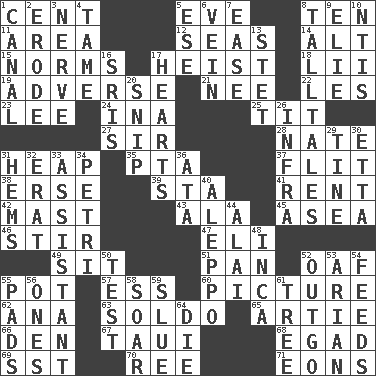 ACROSS 1. Penny 5. First lady 8. Nine, plus one 11. Length times width 12. Oceans 14. The first octave above the treble staff 15. Typical standards 17. Robbery 18. Cards in a Roman deck? 19. Contrary to your interests or welfare 21. Born 22. French article 23. Area sheltered from the wind 24. _ tizzy (2 wds.) 25. Teat (slang) 27. Title for a knight 28. Nathan's nickname 31. Pile 35. Parent Teacher Assoc. 37. Sudden quick movement 38. Celtic language 39. R.R. building 41. Monthly bill 42. Vertical spar for supporting sails 43. Chicken ___ king 45. At sea 46. Use a spoon 47. Biblical high priest 49. Be seated 51. Baking dish 52. Clumsy lout 55. Plant holder 57. Curvy letter 60. Photo 62. Santa ___, CA 63. Twentieth part of a lira 65. Nick name for Arthur 66. Lair 67. "Change" in Tahitian 68. Mild oath 69. Fast jet (abbr.) 70. To sift 71. Immeasurably long periods of time DOWN 1. Lessep's creation 2. Eat (away) 3. Effrontery 4. Docile 5. Compass dir. 6. Distinctive style or manner 7. Comfort 8. Baron Munchausen's specialties 9. Writer Wiesel 10. Nuclear Threat Initiatives 13. Proofreading order 16. Indian titles of respect 17. Centers of feelings and intuitions 20. Sever or remove by pinching or nipping 26. Kind of red light 29. Prong on a fork 30. Singer James 31. Cloth borders 32. Part of Q.E.F. 33. Aide 34. _ dish (used to culture cells) 36. "One Day ___ Time" 40. City in Syria 44. Mountain range southwest of Kyrgyzstan 48. South American Indian 50. Trial 52. Expenditure 53. Believer in; advocate of (suffix) 54. Gives food to 55. Writing tablets 56. Washington bills 58. Fly high 59. Change direction abruptly 61. Woody plant 64. Expire