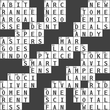 ACROSS 1. "This won't hurt ____!" 5. Curve 8. ___ Haven, CT 11. Indian princess (variant) 13. Born 14. Heavy book 15. Therefore, facetiously 16. Bear (Spanish) 17. Give off 18. Compass dir. 19. Incision 21. Allots cards 22. Broke a traffic law 24. Actor Griffith 25. Michaelmas daisies 27. Spoil 29. Moves 30. Shoestrings 32. Inside; within (prefix) 33. Component 35. Casino tip 39. Don Adams' spy role 41. Advice 42. Followers of ems 43. Electrical Unit 45. Venues 48. Cowardly lion portrayer 49. Make or become more lively 50. "Terrible" tsar 52. To free from 55. Presage 56. Single 57. Maternal 59. Monthly bill 60. _-fi 61. Add up to 62. Curvy letter 63. Air blower 64. Not ill DOWN 1. Caspian sea tributary 2. Oblong pieces of solid material 3. Swallowed 4. Afternoon social gathering 5. At once, immediately (arch.) 6. Repose 7. Corporate head (abbr.) 8. Wanderer 9. Poet Dickinson 10. Moistens 12. A person who is older than you are 14. Adolescent 20. Begley and Asner 21. Have the gumption 23. Mexican monetary units 25. Grow older 26. Male offspring 27. Big _ 28. Adept person 30. Allow 31. Staphylococcus 33. Baking dish 34. Big collection agency 36. Make much ado about nothing 37. Apertif with cassis 38. Compass dir. 40. Chow _ 43. Wing 44. French painter Edouard 45. Citrus fruits 46. Baking chambers 47. Penny 49. Old wives' tales, e.g. 50. South American Indian 51. Distinctive style or manner 53. Slanted text style (abbr.) 54. Small valley 56. Order of Saint Francis (abbr.) 58. At this time