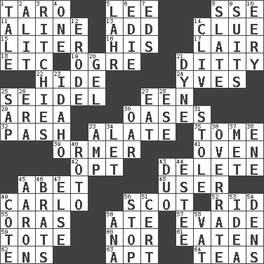 ACROSS 1. Edible starchy tuberous root 5. Area sheltered from the wind 8. Compass dir. 11. Place in a line 13. Say or write further 14. A slight indication 15. 61 cubic inches 16. Part of HMS, perhaps 17. Den 18. And so on (abbr.) 19. Legendary monster 21. Short, simple song 22. Flintstone garb 24. Jacques Cousteau's middle name 25. Beer mug 27. Car or cant ending 29. Type of rug 30. Fertile tracts in a desert 32. Romantic infatuation 33. Having winglike extensions 35. Heavy book 39. Channel Islands abalone 41. Baking chamber 42. Choose 43. Erase 45. Collude with 48. One who makes use of a thing 49. Monte _, Las Vegas Hotel/Casino 50. Native of Scotland 52. To free from 55. Mouths or openings 56. Had dinner 57. Dodge 59. Carryall 60. And not 61. Ingested 62. Followers of ems 63. Fitting 64. Beverages made from leaves DOWN 1. Lie 2. Came down and settled, as after flight 3. Actors Guy, Robert Welles, and Clint 4. Single 5. Cowardly lion portrayer 6. Singer Brickell 7. Begley and Asner 8. Schedule 9. Costumes for special activities 10. Suggestive of the supernatural 12. Wear away 14. 154 in Roman numerals 20. Set 21. Unit of force 23. Potato state 25. Plant excrement 26. Epoch 27. Erode 28. Compass dir. 30. Boat paddle 31. Took without asking 33. Electrical Unit 34. Allow 36. Make much ado about nothing 37. Was introduced to 38. Compass dir. 40. Printing process, for short 43. Superhero pair 44. First name in cosmetics 45. Composer Copland 46. Naughty children 47. Otherwise 49. ____ d'Azur (French Riviera) 50. Cease 51. Foregone conclusion 53. The main thing one is thinking about 54. Lairs 56. Santa ___, CA 58. Large container