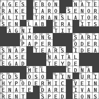 ACROSS 1. Eras 5. Inky black, to poets 9. Nathan's nickname 13. Immoral or dissolute person 14. Pacific island yam 15. Sir (Sp.) 16. Set down 17. Interpreter 19. Elected rep. 20. Experiment locale 21. Epoch 22. It is 23. Hindu god of fire 25. Teat (slang) 26. Amid 30. Indian skirt 34. Some stationery 35. Baltic tributary 36. Fastener 39. Lacerates 42. The content of cognition 43. Comfort 44. Brizilian seaport 46. Mild oath 47. Miss Universe 1986, Barbara Palacios _ 48. Cartoonist voice _ Blanc 51. Pulitzer Prize-winning author Ferber 54. Music discs 57. Bear (Spanish) 58. Shallow baking pan 60. RI univ. 62. Under the skin 65. Distinctive style or manner 66. Related on the mother's side 67. Have the gumption 68. "Terrible" tsar 69. Monthly bill 70. Broke a traffic law 71. Immeasurably long periods of time DOWN 1. Caspian sea tributary 2. An organ shaped like a helmet 3. Supplementing with great effort 4. Put into a specified state 5. Singer James 6. Sharp remark 7. Mouth or opening 8. Music written for nine 9. Teachers' org. 10. Opposed to 11. A blast of a horn 12. Blunders 15. Narrow board 18. _ Lanka 20. Pale green bean 24. Slept 27. Choose 28. Born 29. Monetary aid 30. Dirtied 31. Find the sum of 32. To riddle 33. Lyricist Gershwin 36. Observe 37. Tired old horse 38. White ___ sheet 40. Actress Charlotte 41. Filthy place 45. An important port of Yemen 48. Method 49. Compass dir. 50. Nobles 52. New (sp.) 53. Believer in; advocate of (suffix) 54. "Mermaids" star 55. Unit of force 56. Connect, as a bridge 58. Become fatigued 59. On the rocks 61. Taverns 63. Baseball player Mel 64. Atlas unit 65. Compete