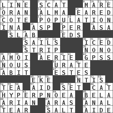 ACROSS 1. Actor's bit 5. Leave at once 9. Female horse 13. NW Algerian seaport 14. _ mater 15. Having ears or earlike features 16. ____ d'Azur (French Riviera) 17. Census information 19. _ tizzy (2 wds.) 20. Cleo's killer 21. For each 22. White ___ sheet 23. Broad, flat, thick piece 25. Begley and Asner 26. Travel by water 30. On the rocks 34. Empty completely 35. Words to Nanette 36. Mine, in Marseilles 39. Nest on high 42. Global Positioning Systems (abbr.) 43. Horse sense 44. A salt of uric acid 46. "This won't hurt ____!" 47. _____ Park, CO 48. Supplement with great effort 51. Nuclear Threat Initiatives 54. Afternoon social gathering 57. Assist 58. Arrange properly for use 60. Feline 62. Abnormally rapid or deep breathing 65. Actor Lugosi 66. Believer in; advocate of (suffix) 67. Ancient river in northeast Turkey 68. Of or related to the anus 69. Pull apart 70. Table seasoning 71. Helper DOWN 1. Event scenes 2. Removes the wrinkles 3. Relating to or accompanying birth 4. Compass dir. 5. Plant excrements 6. Hoof sound 7. Electrical Unit 8. Grayish beige 9. Floor protector 10. Roberta Peters solo 11. Vintage cars 12. Pulitzer Prize-winning author Ferber 15. Hearing organs 18. Directed 20. Blind as ____ 24. Aid 27. Retirement account (abbr.) 28. Whopper 29. Upset 30. Consume 31. Police officer (slang) 32. Followers of ems 33. Two (Sp.) 36. Santa ___, CA 37. Disorderly crowd 38. Fr. "Yes" 40. Big collection agency 41. Erode 45. Portable shelter 48. Merit 49. Sleep 50. Ferber et al. 52. Ancient Celtic tribe of eastern Britain 53. Vegetable dish 54. Not this but _ 55. Jane of fiction 56. Capital of Western Samoa 58. Lick closed 59. 90 degrees 61. Lie 63. Hearing organ 64. Mouth or opening 65. Sound made by sheep