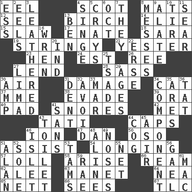 ACROSS 1. Snakelike fish 4. Native of Scotland 8. Floor coverings 12. Perceive with the eye 13. A tree used for making furniture 14. Writer Wiesel 15. Cole _ (cabbage dish) 17. Maternal 18. "Two Mules for Sister ____" 19. Slender, wiry 21. Last 23. Layer 24. Eastern Standard Time (abbr.) 26. Portuguese money of account (variant) 27. Grant temporary use of 28. Backtalk 30. Wind 31. Break 34. Feline 37. Madame (abbr.) 38. Elude 39. Mouth or opening 40. Groovy apt. 41. Sounds asleep 42. Was introduced to 43. Jacques of French films 44. Balmoral and tarboosh 46. Electrically charged atom 47. Daniel's nick name 50. Bear (Spanish) 51. Aid 54. Yearning 57. Hang loosely or laxly 58. Ascend 60. 480, 500 or 516 sheets of paper 62. Toward shelter 63. French painter Edouard 64. Teachers' org. 65. Remaining after all deductions 66. Observes 67. Affectionate concern, for short DOWN 1. Curvy letter 2. Snakelike fish 3. Resembling or made to resemble leather 4. Burn superficially 5. Trading vessels 6. Sep. follower 7. Those things 8. Makes clutter 9. Having winglike extensions 10. Become fatigued 11. Dry up 13. Benjamin's nick name 16. Songbird 20. Working for oneself (abbr.) 22. Celtic language 25. Sadhe (variant) 27. Pale green bean 29. Eons 30. Electrical Unit 31. Gouge 32. Keep away from 33. Third mo. 34. Part 35. Ancient Greek god of war 36. Make lace 41. Without 43. Bathroom 44. Gear tooth 45. SW Saudi Arabia district 46. Small island 48. Place in a line 49. Olfactory organs 51. Actor Alda or Thicke 52. Not divided or shared with others 53. Scottish caps 55. Fish or hair follower 56. Highlander 59. Actress Charlotte 61. Big _