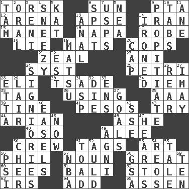 ACROSS 1. Cod relative 6. Player for Phoenix 9. Parent Teacher Association (abbr.) 12. Sports stadium 13. Domed church section 14. SW Asia republic 15. French painter Edouard 16. California wine valley 17. Loose flowing garment 18. Untruth 19. Floor protectors 20. 911 reaches them 21. Ardor 23. Cuckoo 24. System (abbr.) 25. _ dish (used to culture cells) 28. Biblical high priest 30. Sadhe (variant) 34. South Vietnam president (1954) 35. Label 36. Putting into practice 38. Auto club (abbr.) 39. Prong on a fork 41. Mexican monetary units 43. Attempt to accomplish something 44. Believer in; advocate of (suffix) 46. American tennis player Robert 48. Bear (Spanish) 49. Toward shelter 50. Ship's personnel 51. Labels 53. Nonscientific branch of learning 56. Silvers or Donahue 57. Part of speech 58. Relatively large 60. Observes 61. Indonesian resort city 62. Fur scarf 63. Big collection agency 64. Increase 65. NE Netherlands city DOWN 1. Scottish cap 2. Relating to the mouth 3. Painter Guido (1575-1642) 4. Dwarf with a sinus problem 5. Krazy ___ of comics 6. Argument over a trivial matter 7. United States Postal Service (abbr.) 8. Teachers' org. 9. Conciliate 10. Bar bills 11. A saturated hydrocarbon 13. Of or related to the anus 14. Pressed 19. Taiwanese island in East China Sea 20. Head covering 22. Eastern Standard Time (abbr.) 24. Seigniories (variant) 26. Rump 27. "If ____ say so..." 28. Singer James 29. Den 31. Viper 32. Expire 33. Followers of ems 37. Scores awarded for successful feats 40. Artist's stands 42. Compass dir. 45. At this time 47. Centers of feelings and intuitions 49. Hindu god of fire 50. "Mermaids" star 51. Frog relative 52. Old (Scot.) 54. Vintage cars 55. Lie 56. 23rd letter of the Greek alphabet 57. Basketball assoc. 58. Girls' org. (abbr.) 59. "___ Little Indians"