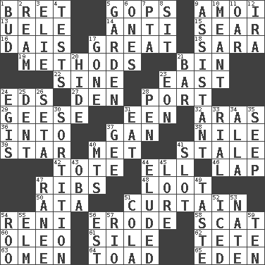 ACROSS 1. Cy Young winner Saberhagen 5. Republicans 9. Mine, in Marseilles 13. Ubangi River tributary 14. Against 15. Shrivel 16. Raised platform 17. Relatively large 18. "Two Mules for Sister ____" 19. Modes 21. Storage container 22. Trig term 23. Compass direction 24. Begley and Asner 27. Lair 28. Sweet dark-red dessert wine 29. Honkers 31. Car or cant ending 32. Caspian sea tributary 36. To the inside or interior of 37. Separate the seeds from cotton 38. Mediterranean tributary 39. Play the lead 40. Was introduced to 41. Having lost freshness 42. Haul 44. Pipe bend 46. Pet locale 47. Teases 48. Spoils 50. _ moment's notice (2 wds.) 51. Window treatment 54. Painter Guido (1575-1642) 56. Wear away 58. Scram! 60. Butter sub 61. Filth; sediment 62. False hair 63. Sign of things to come 64. Frog relative 65. Paradise DOWN 1. Partially opened flower 2. 480, 500 or 516 sheets of paper 3. Writer Wiesel 4. Trials 5. Place where plants grow 6. Washington bills 7. Parent Teacher Assoc. 8. Be seated 9. Aide 10. Intended 11. Boat paddle 12. Retirement account (abbr.) 17. Went 20. Flintstone garb 21. Oblong piece of solid material 23. Age 24. The front part of a cuirass 25. Incision 26. Bristle 28. Fenced enclosure 30. Conclusion 31. Erode 33. Monetary unit of Yemen 34. Silent film actress Nazimova 35. Ooze 37. Turn to the right 40. Mountains (abbr.) 41. Groove 43. Chief or king in Benin or Nigeria 44. Dodged 45. Old wives' tales, e.g. 47. The wife of a rajah (variant) 49. Clothes sense 51. Root beer relative 52. On the rocks 53. Nathan's nickname 54. Friend of Pooh 55. Shade tree 56. Eastern Standard Time (abbr.) 57. _ de Janeiro 59. Nine, plus one