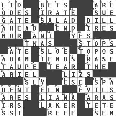 ACROSS 1. Hat (slang) 4. Stakes 8. "We ___ not amused" (Victoria) 11. Lyric poems 13. Feeling or showing extreme anger 15. Institute legal proceedings 16. Yard entry 17. Vegetable dish 18. Deli pickle 19. At or in the front 21. Conclusion 22. Angers 23. Or not 24. Cuckoo 27. Consenting reply 29. It was, poetically 30. Halts 34. Had dinner 36. _ gin 39. Traditional theme or motif 40. First man 41. Watches over 43. To erase 44. Grayish beige 46. Rend 47. Definite Article 48. Satellite of Uranus 49. Belonging to Elizabeth 51. Insidious 53. Compass dir. 54. Health resort 57. Incision 60. Shade tree 63. Vices 65. Ancient Greek god of war 66. Woody, climbing, usually tropical plant 69. Ancient river in northeast Turkey 70. Big collection agency 71. Member of a famous L.A. basketball team 72. False hair 73. Fast jet (abbr.) 74. Coral ridge 75. Elected rep. DOWN 1. Utah city north of Ogden 2. Potato state 3. Prevent from occurring 4. Altar cloth linen 5. Period 6. Lie 7. Comedian Laurel of Laurel & Hardy 8. SW Saudi Arabia district 9. Court order 10. Snakelike fish 12. Ocean 14. Whirlpool 18. What propaganda does 20. Simpleton 25. Political cartoonist Thomas 26. Small island 28. Eastern Standard Time (abbr.) 29. Storms 31. Brightly colored fish 32. Introduce or present, as a question 33. Compass dir. 34. The sixth month of the Jewish calendar 35. "Change" in Tahitian 37. Single 38. Peak District village in England 40. _ moment's notice (2 wds.) 42. Indian titles of respect 45. Pipe bend 50. Last letter of the English alphabet 52. Shout 54. Male parents of animals 55. Food holder 56. NE Netherlands city 57. Raised platform 58. Blunders 59. A home for chicks 61. One who doesn't tell the truth 62. Create 64. Large container 67. Born 68. Sandy's bark