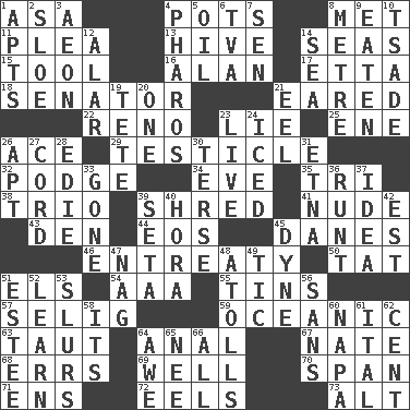 ACROSS 1. White ___ sheet 4. Plant holders 8. Was introduced to 11. Entreaty 13. Hub of activity 14. Oceans 15. Utensil 16. Actor Alda or Thicke 17. Singer James 18. Legislator 21. Having ears or earlike features 22. Western Nevada city 23. Whopper 25. Compass dir. 26. Adept person 29. One of the two male reproductive glands 32. Puddle 34. Night before a holiday 35. Three (prefix) 38. Musical group of three 39. Tear up 41. Unadorned 43. Lair 44. Greek goddess of the dawn 45. Natives or inhabitants of Denmark 46. Plea 50. Make lace 51. Raised railways 54. American Automobile Association (abbr.) 55. Airtight sealed metal containers 57. Major League Baseball Commissioner Bud 59. Pertaining to the sea 63. Pulled tight 64. Of or related to the anus 67. Nathan's nickname 68. Blunders 69. Not ill 70. Connect, as a bridge 71. Followers of ems 72. Snakelike fish 73. Keyboard modifier key DOWN 1. Flats, for short 2. _ gin 3. Period of immesurable duration 4. N Egypt peninsula 5. Lubricate 6. Federal power corp. 7. Elected rep. 8. Distance measurement (Brit.) 9. Ingested 10. Sadhe (variant) 12. Having or resembling wings 14. Ocean 19. False hair 20. Single 21. Snakelike fish 23. Not recorded 24. On the rocks 26. Fitting 27. Drawstring 28. Singer Brickell 30. Laconic 31. Inactive volcano in Sicily 33. Went 36. The smallest animal of a litter 37. The main thing one is thinking about 39. Bristle 40. Israeli folk dance 42. Eastern Standard Time (abbr.) 45. Centimeter-gram-second unit of force 47. Tired old horse 48. Ringlike coral islands and reefs 49. Nervous spasm 51. First name in cosmetics 52. Acquire or gain knowledge or skills 53. Plays smoothly or legato 56. Without 58. It is 60. California wine valley 61. Slanted text style (abbr.) 62. Penny 64. Deep reverence 65. Born 66. Everything