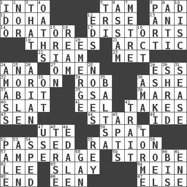ACROSS 1. To the inside or interior of 5. Scottish cap 8. Writing tablet 11. Capital of the state of Qatar 12. Celtic language 13. Black tropical American cuckoo 14. Speaker 17. What propaganda does 19. Trios 21. Northern region 22. Thailand, formerly 23. Was introduced to 24. Santa ___, CA 27. Sign of things to come 29. Double-curved letter 32. Person of subnormal intelligence 34. Director Reiner 36. American tennis player Robert 37. "This won't hurt ____!" 38. Girls' org. (abbr.) 39. Hindu Mythology: god of death 40. Narrow board 41. Snakelike fish 42. Receives possession of 43. Elected rep. 44. Play the lead 46. Binary compound 47. Shoshoni 50. Petty quarrel 52. Went by 55. Food allowance for one day 57. Electrical Measurement 59. Disco prop 62. Area sheltered from the wind 63. Kill 64. Chow _ 65. Conclude 66. Car or cant ending 67. Otherwise DOWN 1. Wedding promise 2. Not either 3. Not this but _ 4. Curses 5. Three (prefix) 6. Indian state 7. Distance measurement (Brit.) 8. Component 9. Opposed to 10. Compact _ 12. Begley and Asner 15. Greek mythologigal hunter 16. 480, 500 or 516 sheets of paper 18. Sep. follower 20. Develop 24. Collect or gather 25. Impressive in appearance 26. Believer in; advocate of (suffix) 28. Olfactory organs 29. 1973 Nobel Price Winner (Physics) Leo 30. Tear up 31. Gospel singer Marvin 33. Baseball player Mel 35. Greek mezzo-soprano Agnes 36. Wet nurse (var.) 42. Distinguishing feature 45. Tenement units (abbr.) 47. Purpose 48. Laconic 49. Peak District village in England 51. Singer Mel 52. Light colored 53. So be it 54. Moved rapidly 55. Marina Del _, California 56. Christmas carol 58. Separate the seeds from cotton 60. Twice 61. Compass dir.
