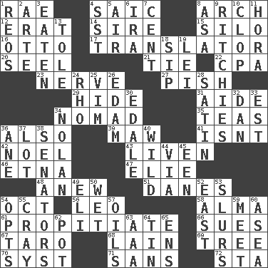 ACROSS 1. Actress Charlotte 4. Ketch in the Levant 8. Bowlike part 12. Part of Q.E.F. 14. Male parent of an animal 15. Grain storage tower 16. Von Bismarck 17. Interpreter 20. Stitch closed the eyes of (a falcon) 21. Neckwear 22. Numbers guy (abbr.) 23. Impudent aggressiveness 27. Expression of disdain 29. Flintstone garb 31. Assistant 34. Wanderer 35. Beverages made from leaves 36. In addition 39. Informal term for the mouth 41. Is not 42. Christmas carol 43. Make or become more lively 46. Inactive volcano in Sicily 47. Writer Wiesel 48. Afresh 51. Natives or inhabitants of Denmark 54. Sep. follower 56. Lion 58. _ mater 61. Appease 66. Institutes legal proceedings 67. Edible starchy tuberous root 68. (Had) reclined 69. Relationship diagram 70. System (abbr.) 71. Without 72. R.R. building DOWN 1. Vintage cars 2. Johnson of "Laugh-In" 3. Ingested 4. Fast jet (abbr.) 5. Wind 6. Lyricist Gershwin 7. Penny 8. White ___ sheet 9. Actors Guy, Robert Welles, and Clint 10. Hoof sound 11. Israeli folk dance 13. Lacquered or enameled metalware 18. Small drink 19. Luau accessory 24. 17th letter of the Greek alphabet 25. Zeal 26. Dutch treat 28. Smooth fabric 30. Peak District village in England 32. Daniel's nick name 33. Eastern Standard Time (abbr.) 34. Pitcher Ryan 36. A saturated hydrocarbon 37. Car dealer's back yard 38. Elected representatives 40. Uncontrolled 44. By way of 45. Car or cant ending 49. Connecticut Ivy Leaguer 50. Dripping 52. Compass direction 53. Disparaging remarks 54. Elects 55. Supercomputer manufacturer 57. Lubricates 59. Confront 60. At sea 62. Plant holder 63. American Automobile Association (abbr.) 64. Metal container 65. Followers of ems