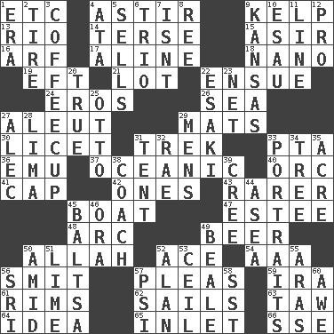 ACROSS 1. And so on (abbr.) 4. Being in motion 9. Seaweed 13. River (Sp.) 14. Laconic 15. SW Saudi Arabia district 16. Sandy's bark 17. Place in a line 18. Billionth: prefix 19. Newt 21. Car dealer's back yard 22. Take place subsequently 24. Greek god of love 26. Ocean 27. Eskimo relative 29. Floor coverings 30. It is permitted: Lat. 31. Long journey 33. Parent Teacher Assoc. 36. Australian flightless bird 37. Pertaining to the sea 40. The grampus (Milton) 41. Head covering 42. Washington bills 43. More valued for its uncommonness 45. Water vessel 47. First name in cosmetics 48. Curve 49. Fermented drink made from hops 50. Assad's deity 52. Adept person 54. Auto club (abbr.) 56. Stricken, poetically 57. Entreaties 59. Lyricist Gershwin 61. Basketball hoops 62. Moves on water 63. The 23rd letter of the Hebrew alphabet 64. The main thing one is thinking about 65. An arm off of a larger body of water 66. Compass dir. DOWN 1. Period 2. Hoop that covers a wheel 3. Java holder (2 wds.) 4. _ moment's notice (2 wds.) 5. Makes a sale 6. Musical group of three 7. Is not 8. Portuguese money of account (variant) 9. Sunflower state 10. He sold his birthright 11. Actor's bit 12. Adept person 20. Loyal 22. 1973 Nobel Price Winner (Physics) Leo 23. Fish or hair follower 25. "Beetle Bailey" pooch 27. Actor Baldwin 28. Pale green bean 29. Not women's 31. Portable shelter 32. Actress Charlotte 33. Likenesses of persons 34. Woody plant 35. 43,560 square feet 38. Team commander 39. Algonquian 44. Toward the sea 45. Greek mezzo-soprano Agnes 46. Mouth or opening 49. Calif. Air Force Base 50. Among 51. Welles in "The Third Man" 52. Actor Alda or Thicke 53. To provide with a ceiling 55. Ancient river in northeast Turkey 56. Indian title of respect (Mr.) 57. 23rd letter of the Greek alphabet 58. Fast jet (abbr.) 60. Deep reverence