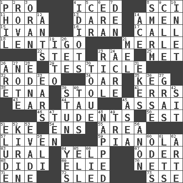 ACROSS 1. Adept person 4. On the rocks 8. _-fi 11. Israeli folk dance 13. Have the gumption 14. So be it 15. "Terrible" tsar 16. SW Asia republic 17. Give a ring to 18. Small, flat, pigmented spot on the skin 21. Haggard of country music 22. Proofreading order 23. Actress Charlotte 25. Was introduced to 26. One (Scot) 29. One of the two male reproductive glands 32. Cowboy competition 34. Boat paddle 35. Cask 38. Inactive volcano in Sicily 39. Took without asking 41. Blunders 43. Hearing organ 44. The 19th letter of the Greek alphabet 45. Slender Brazilian palm 46. SAT takers 50. Eastern Standard Time (abbr.) 51. Supplement with great effort 54. Followers of ems 55. Type of rug 57. Make or become more lively 59. Player piano 63. Mountain range 64. Sharp bark 67. River in Europe 68. "You Light Up My Life" star Conn 69. Writer Wiesel 70. Remaining after all deductions 71. Compass dir. 72. Downhill vehicle 73. Compass dir. DOWN 1. Silvers or Donahue 2. Be footloose 3. Northwest Algerian city 4. Foolish or stupid persons 5. 4-wheeled motor vehicle 6. Epoch 7. Lair 8. Excessive but superficial compliments 9. Cell (Danish) 10. An arm off of a larger body of water 12. Pismires 14. Adept person 19. "Tell ____ the Marines!" 20. Unit of force equal to gravity 21. Cartoonist voice _ Blanc 23. Monetary unit of Yemen 24. 43,560 square feet 26. "We ___ not amused" (Victoria) 27. Brief written record 28. Pulitzer Prize-winning author Ferber 30. Woman's close-fitting hat 31. Supplements with great effort 33. Hearing organs 36. Celtic language 37. Pate de foie ____ 39. Surprise greatly 40. Small amounts or degrees 42. Be seated 45. At sea 47. Nine, plus one 48. Slept 49. Three (prefix) 51. Evade 52. Japanese brewing company 53. Dodge 56. At once, immediately (arch.) 58. Biblical high priest 60. Lyric poems 61. Allows 62. Johnson of "Laugh-In" 64. Consenting reply 65. Pipe bend 66. Whopper