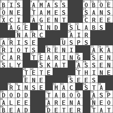 ACROSS 1. Altar cloth linen 4. Collect or gather 9. Mitch Miller's instrument 13. Single 14. Makes less strong or intense 15. Without 16. One more than ninety 17. Representative 18. Algonquian 19. Personal question 21. Working for oneself (abbr.) 22. Broad, flat, thick pieces 24. Drug cop 26. Atmosphere 27. Ascend 29. United States Postal Service (abbr.) 30. Disturbances 31. Painter Guido (1575-1642) 33. Alias (abbr.) 36. Auto 37. Rending 40. Elected rep. 41. Cunning 42. Three-handed card game 43. NE Netherlands city 45. Wig 47. One or ones belonging to thee 48. Compass dir. 49. Perceives with the eye 50. Remove soap 52. Big _ 54. R.R. building 56. Texas town _ City 57. Off limits 59. Cleo's killer 61. Toward shelter 62. Sports stadium 63. Modern: prefix 64. Necklace unit 65. Prevent from occurring 66. Make lace DOWN 1. Gift holder 2. South American Indian 3. Signiory (variant) 4. "One Day ___ Time" 5. Mysterious quality of enchantment 6. So be it 7. Post 8. Fast jet (abbr.) 9. Motion picture awards 10. Sharp remark 11. Washington bills 12. Compass dir. 20. Compass direction 22. Indian antelope 23. Mouth edge 25. Relief 27. Arches 28. Monetary unit of Yemen 29. A single undivided whole 31. Libertine 32. Epoch 33. Aide 34. Peachy ____! 35. Singer Murray 38. First name in cosmetics 39. Yard entry 44. "______ My Girl" (Turtles hit) 45. Watched over 46. Followers of ems 49. Biscuitlike quick bread 50. Hero or heavy, e.g. 51. The content of cognition 52. Female horse 53. Collude with 55. At sea 56. Apply (a substance) by light strokes 57. Small amount or degree 58. Boat paddle 60. Cooking vessel