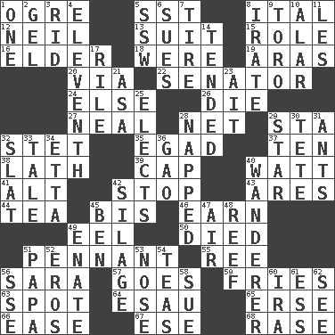 ACROSS 1. Legendary monster 5. Fast jet (abbr.) 8. Slanted text style (abbr.) 12. Famous astronaut Armstrong 13. Set of matching outer garments 15. Hero or heavy, e.g. 16. A person who is older than you are 18. We are 19. Caspian sea tributary 20. By way of 22. Legislator 24. Otherwise 26. Pass on 27. Anneal 28. Fish or hair follower 29. R.R. building 32. Proofreading order 35. Mild oath 37. "___ Little Indians" 38. Thin strip of wood or metal 39. Head covering 40. Electrical Unit 41. Keyboard modifier key 42. Close up, plug up 43. Ancient Greek god of war 44. Beverage made from leaves 45. Altar cloth linen 46. Merit 49. Snakelike fish 50. Passed on 51. Pre-World Series prize 55. Portuguese money of account (variant) 56. "Two Mules for Sister ____" 57. Moves 59. Strips of potato fried in deep fat 63. Specific locale 64. Son of Isaac 65. Celtic language 66. Relaxation 67. Compass dir. 68. To erase DOWN 1. Single 2. Set 3. To free from 4. Veterans Day date 5. Compass dir. 6. Institutes legal proceedings 7. Hoop that covers a wheel 8. Feeling or showing extreme anger 9. "Corrida" creature 10. Having or resembling wings 11. French article 14. Looked after 17. Cause heat under the collar 21. White ___ sheet 23. Small island 25. Opts 28. Slept 29. Play the lead 30. False hair 31. Pismires 32. Narrow board 33. Story 34. Singer James 36. E Mali city 40. Roamer 42. Fodder prepared in a silo 45. Benjamin's nick name 47. Wind 48. Coral collection 49. Maternal 51. Dad 52. Greek god of love 53. Sense of smell 54. Beverages made from leaves 56. Compass dir. 58. Institute legal proceedings 60. Retirement account (abbr.) 61. Double-curved letter 62. Observe
